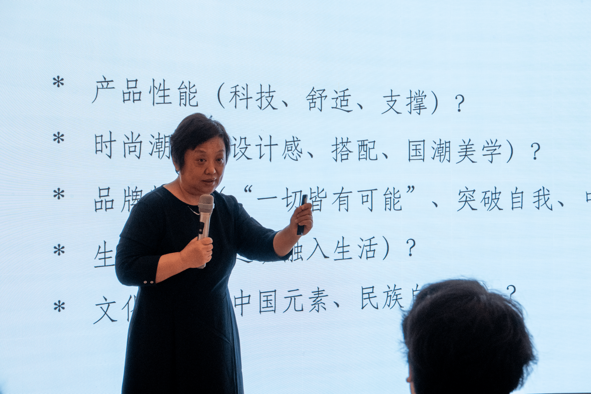 深入探讨李宁品牌时,程院长展示了多组广告素材,引导现场思考品牌认知。同学们普遍将李宁与“运动产品”“国潮”、“国货之光”等标签紧密关联。李穗同学精辟总结:“李宁的核心是卖运动产品,国潮是它贴上的标签。”程院长高度认同这一观察,并一针见血地指出了李宁当前面临的核心战略困境——在“国潮标签”与“运动科技本质”之间出现了严重的战略失衡,李宁在拥抱国潮风口、塑造潮流形象投入巨大且成效显著,但相对忽视了对运动品牌安身立命之本——产品功能性与运动科技的持续深耕。