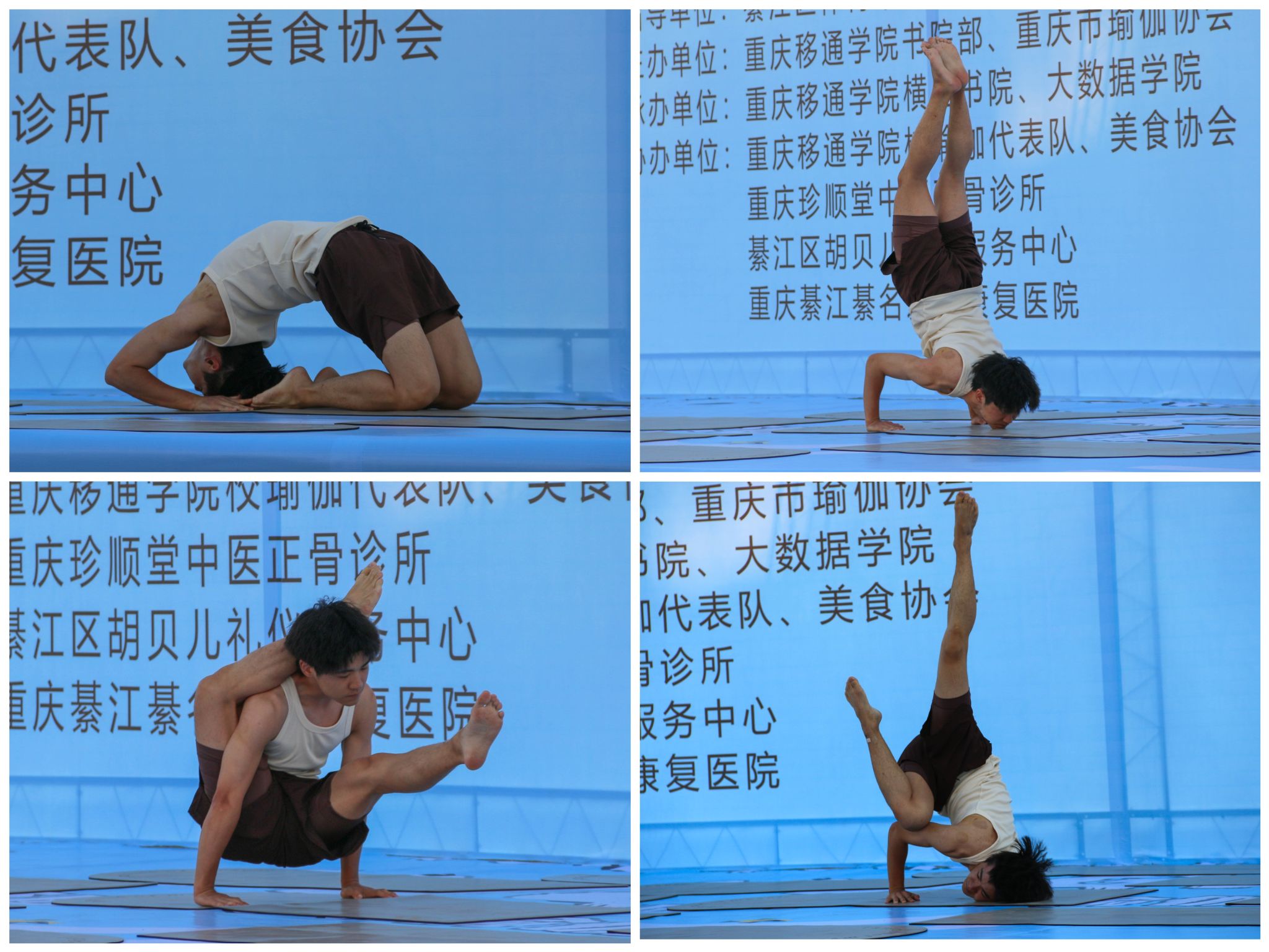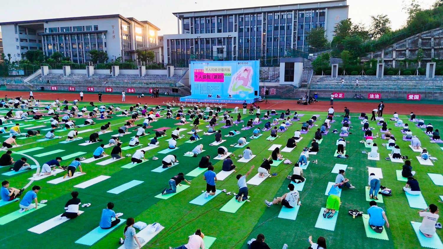 校瑜伽队以一段力量与柔美交织的高阶体式串联表演点燃全场,展现了移通学子刚柔并济的专业底蕴;特邀导师CIP国际认证培训导师、重庆瑜伽艺术节发起人范志颖在一段澎湃电音中演绎先锋瑜伽艺术,将现代律动与传统体式精妙融合,每一个流动衔接都引发惊呼;真正的震撼始于千人共修,国际品牌lululemon大使杨莹领衔,重庆市沙坪坝区瑜伽协会会长白瑶、全国健身瑜伽冠军晏正芳两位专业瑜伽导师联袂引领,通过标准化指令调动千名学子同步调息,当深长呼吸与基础体式在统一节奏中起伏,场地上空仿佛形成无形能量网,千人如一的气息共振如浪潮般席卷现场,最终形成“千人呼吸共振”的震撼场面。