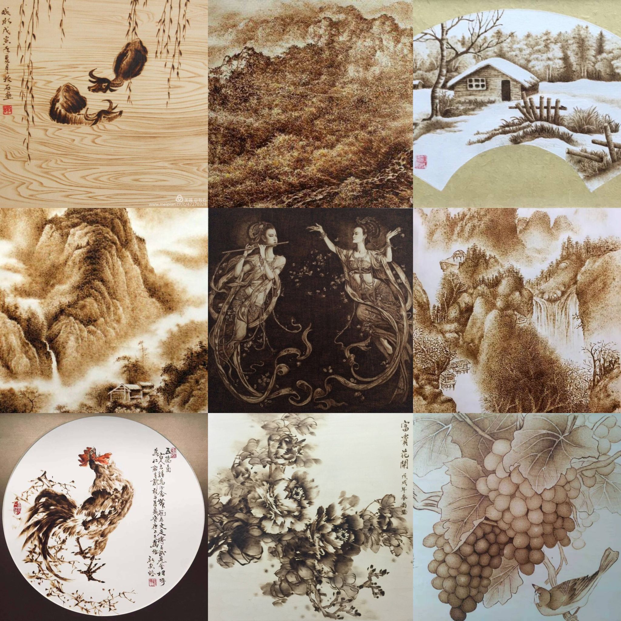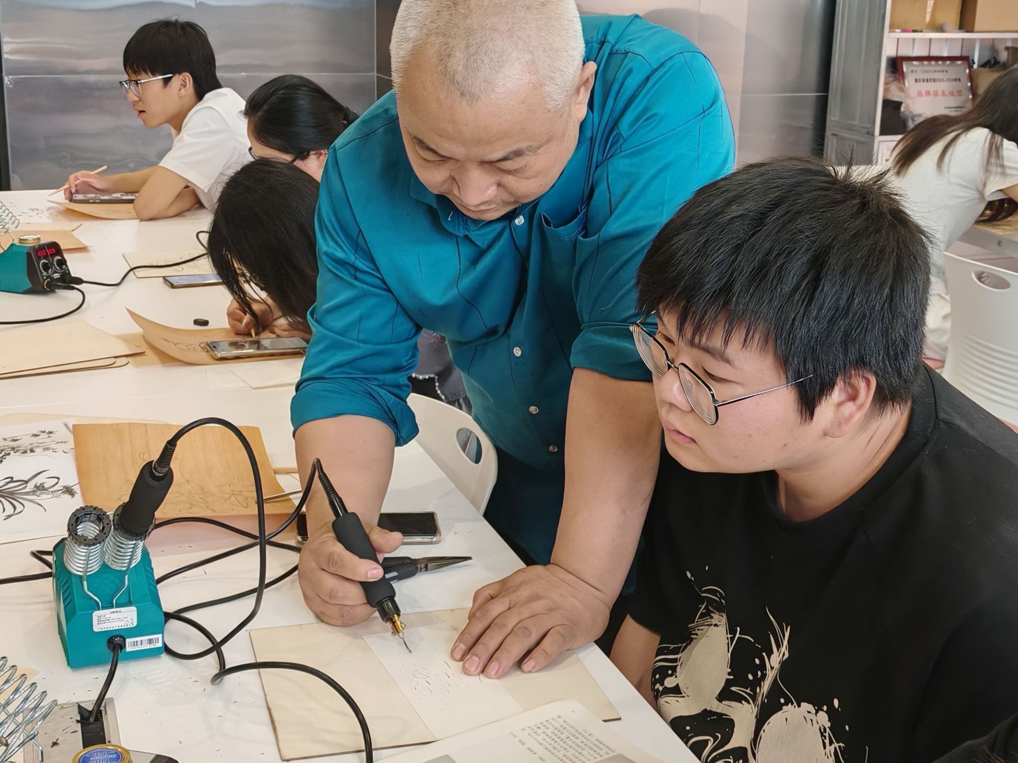 “以火为墨,烙古印今”,在实践教学中通过提供一对一指导,助力大家将课堂所学转化为创作实践。面对手中的烙笔与木板,学子们在王云老师的悉心点拨下,反复练习 “勾、皴、点、染、烫” 等技法,也深入领会 了“三分构图七分火候” 的烙画精髓。