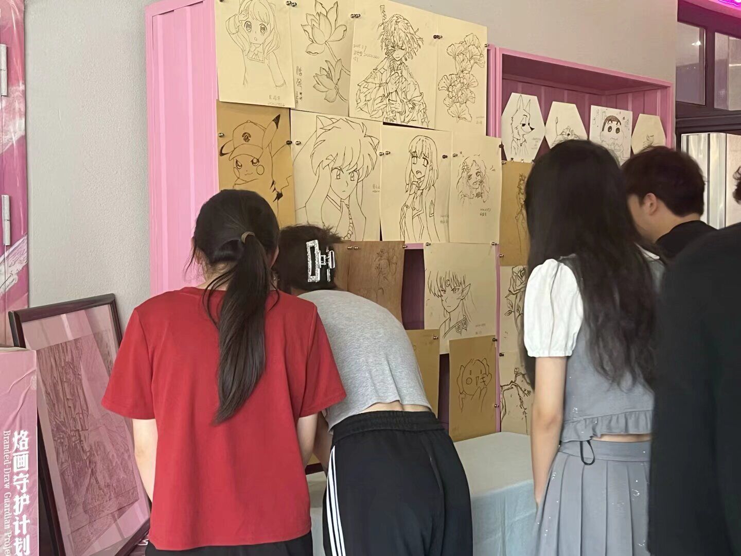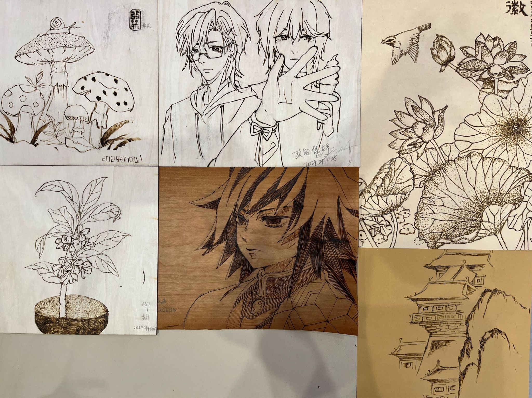 “画载心语,留香百里”,丁山书院温情打造,展览四次课程共几十余副同学们的作品。每一副画作都是青春的独白,也是对传统技艺的续写。同学们将高温烙铁化作神奇画笔,在木板上精心勾勒。线条或刚劲有力,或细腻婉转,烙痕深浅交织间,古朴的纹理与焦褐色泽自然交融,赋予了作品独特的魅力。参与创作的丁山书院/数字经济商学院的田芯同学感慨道,“看着自己用烙笔反复雕刻的木板,从素面无华的原材料变成永久陈列的艺术作品,突然理解‘火痕载韵’的含义。”