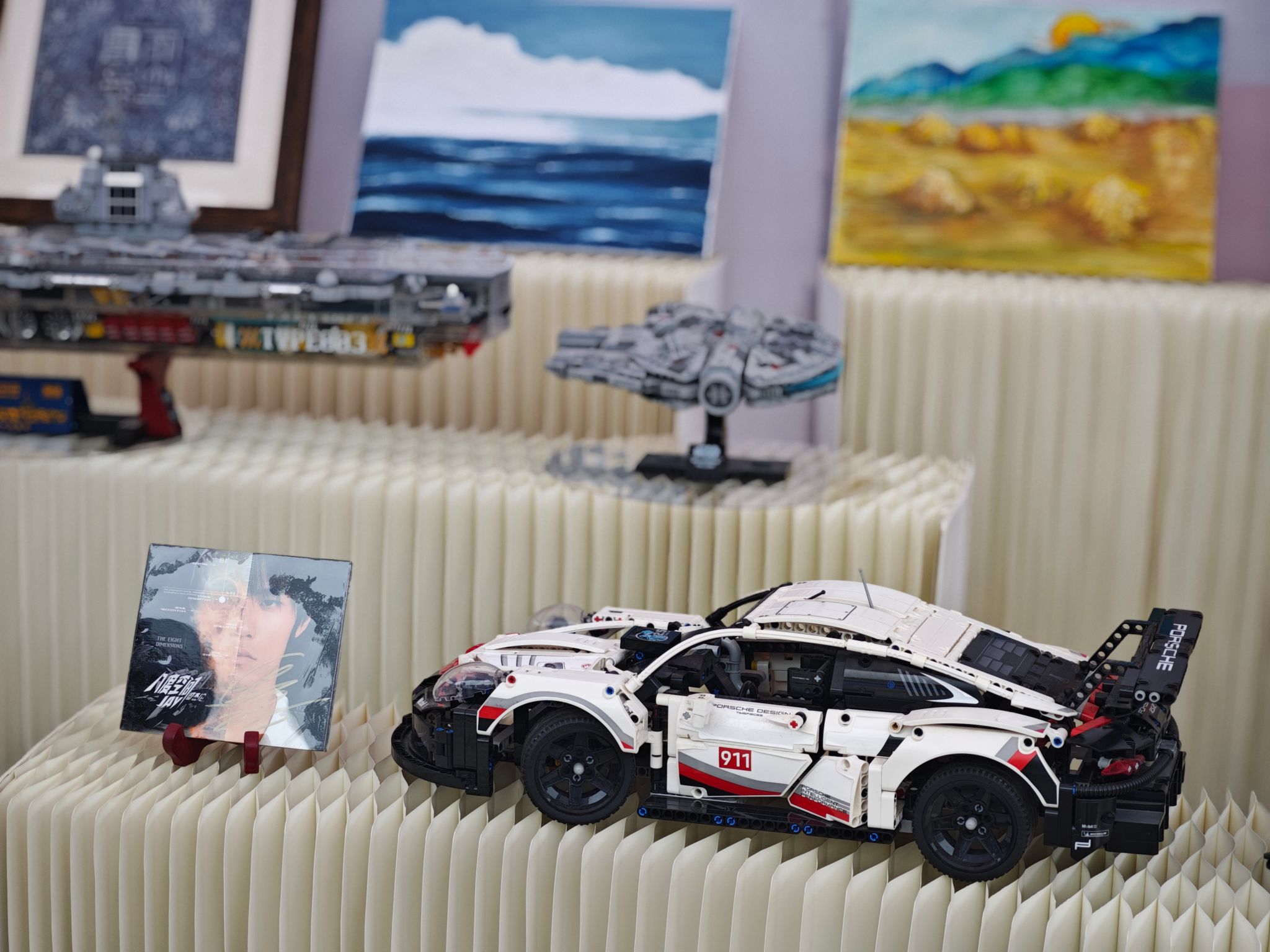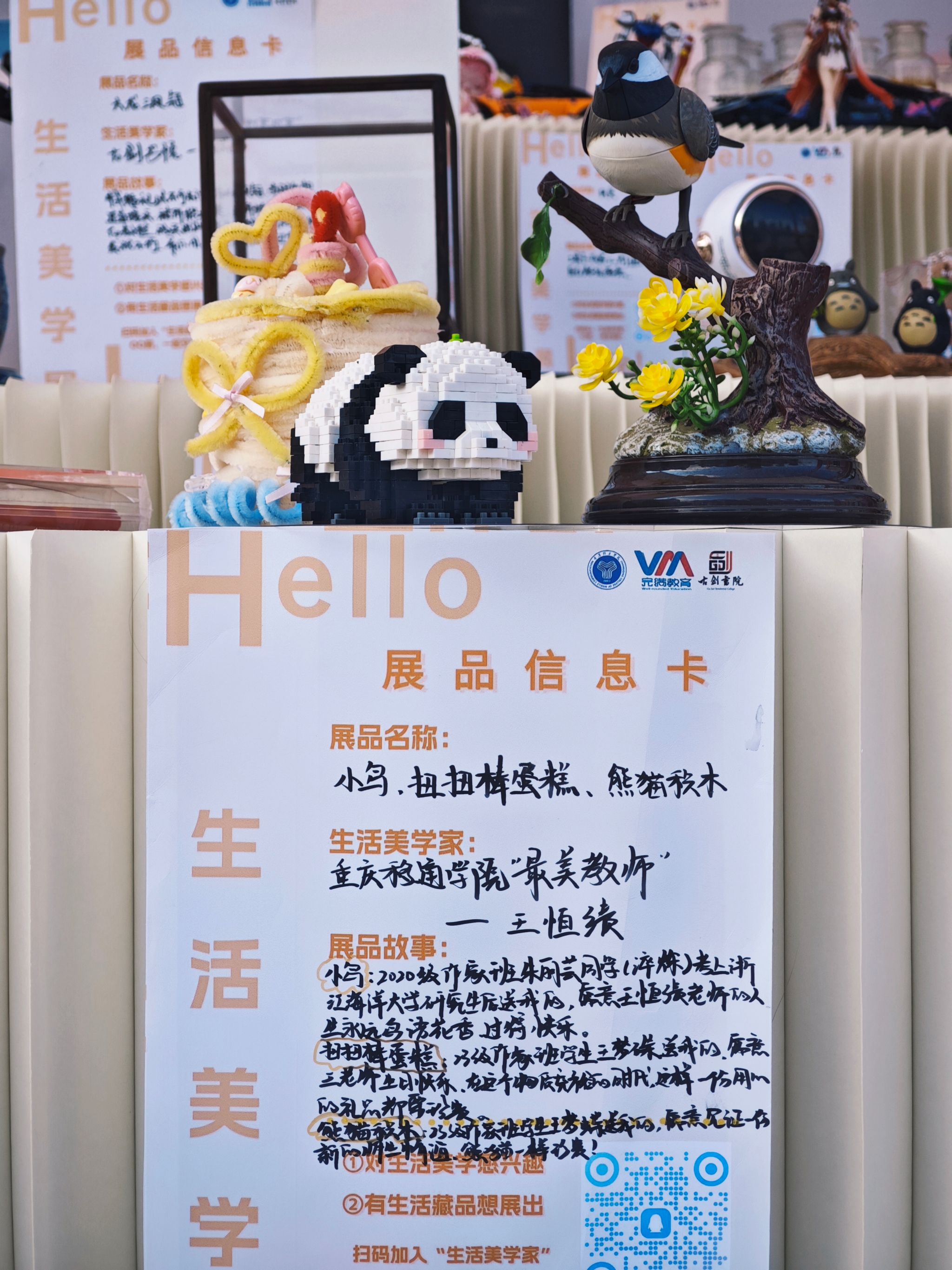 为打造好师生互动、美育共生的特色育人环境,此次展览还设置了“教师生活美学”特展单元,邀请了校内各部门的21位教师代表联袂参展,该展区的展品聚焦“育人记忆”与“生活格调”双主线展开:有来自“最美教师”王恒绩老师珍藏的毕业学生的手工赠礼、戏剧影视学院王芳副院长10年前与学生在侗寨写生时共创的蜡染作品、电影评论中心谭雪老师生活中亲手绘制的油画,还有来自綦河书院张天赐老师耗时数日拼装数千枚零件的乐高积木模型和周杰伦亲笔签名等。这些承载育人温度与生活美学的教师展品,将教师的生活之美与学生的情感之美在此美美与共,更将展览空间转化为可触摸、可感知的沉浸式教育场域。