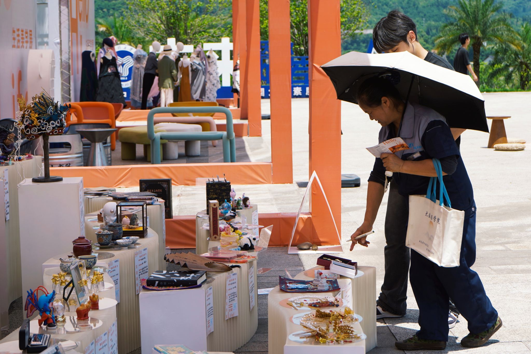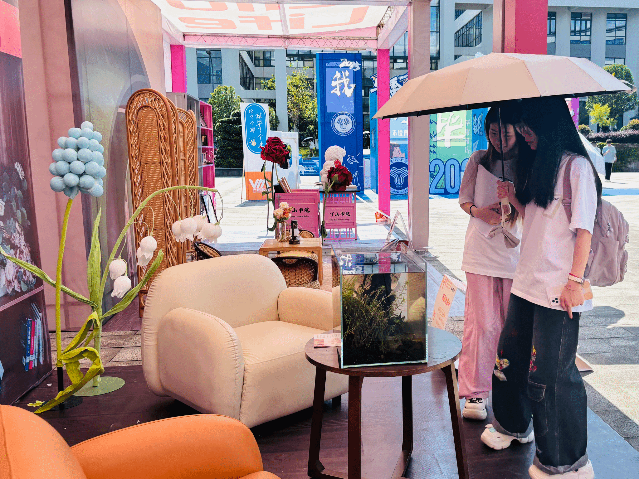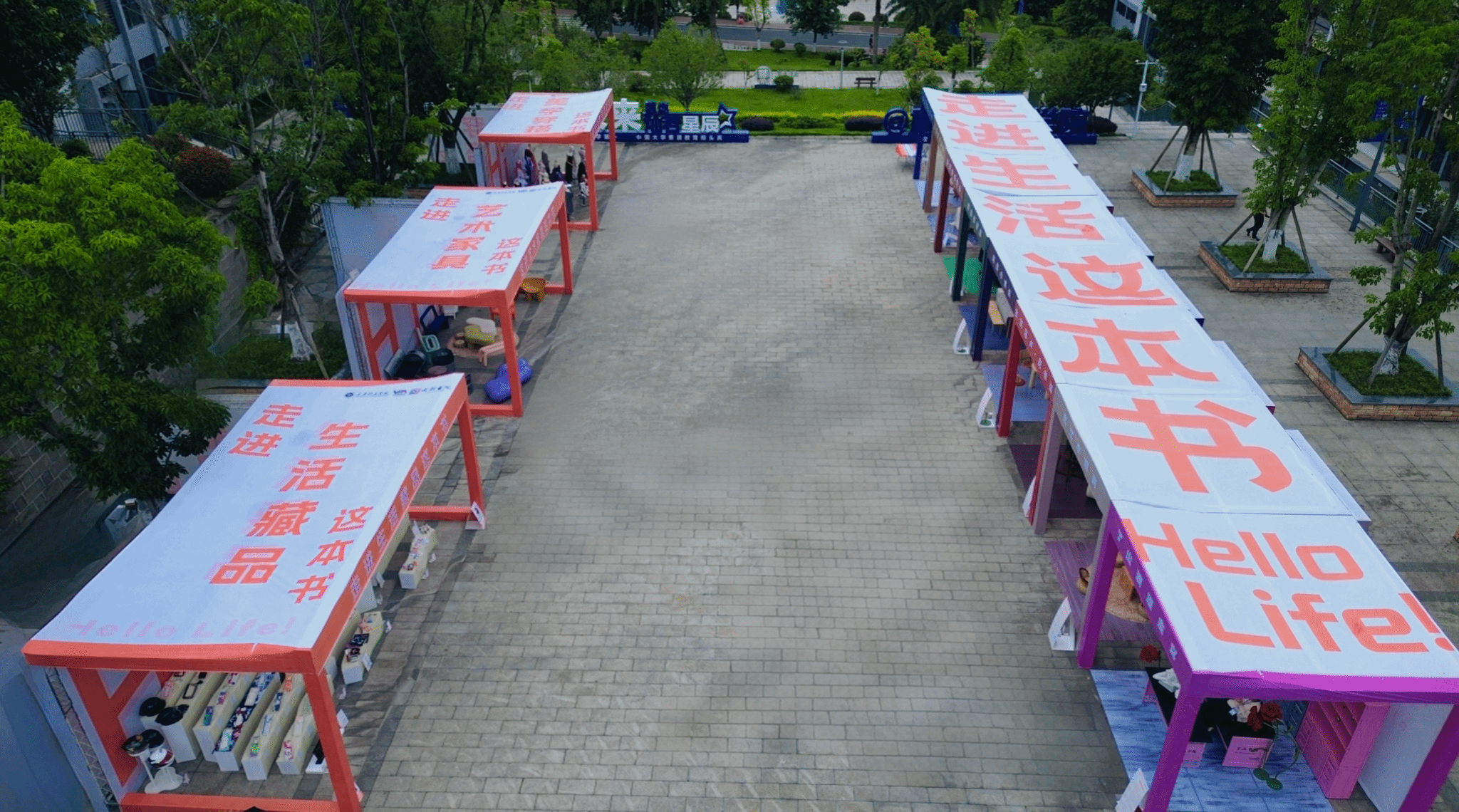 为匹配师生观展需求,本届展览从书院后街600㎡空间迁移至图书馆前1600㎡广场,以“双轴四区”布局构建生活美学体验场。