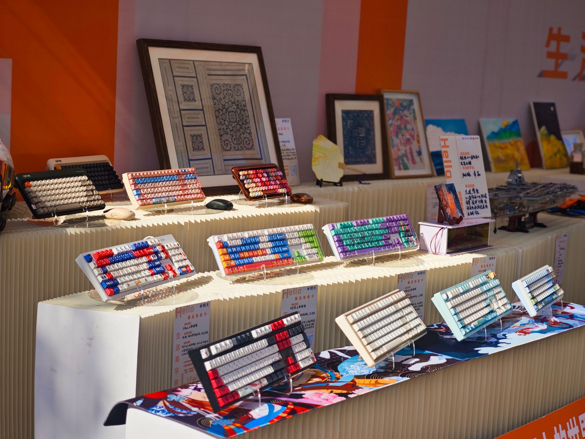 前者展出20余件学生原创键帽,涵盖“动漫键帽”“游戏文化”“西游取经”“美食萌趣”等多元主题,将动漫角色、游戏符号、传统文化与生活趣味转化为可触碰的实用美学物件;特别值得关注的是,展区获全网粉丝共计超300万的“Varmilo 阿米洛”“Lofree 洛斐”两大美学键盘厂商官方特别支持,其提供的展品包括阿米洛的《洛神赋》《睡莲》等IP文化艺术键盘,及洛斐的《口红》《粉底》等生活美学概念键盘,与学生作品形成“校园创意—产业美学”的生动呼应。