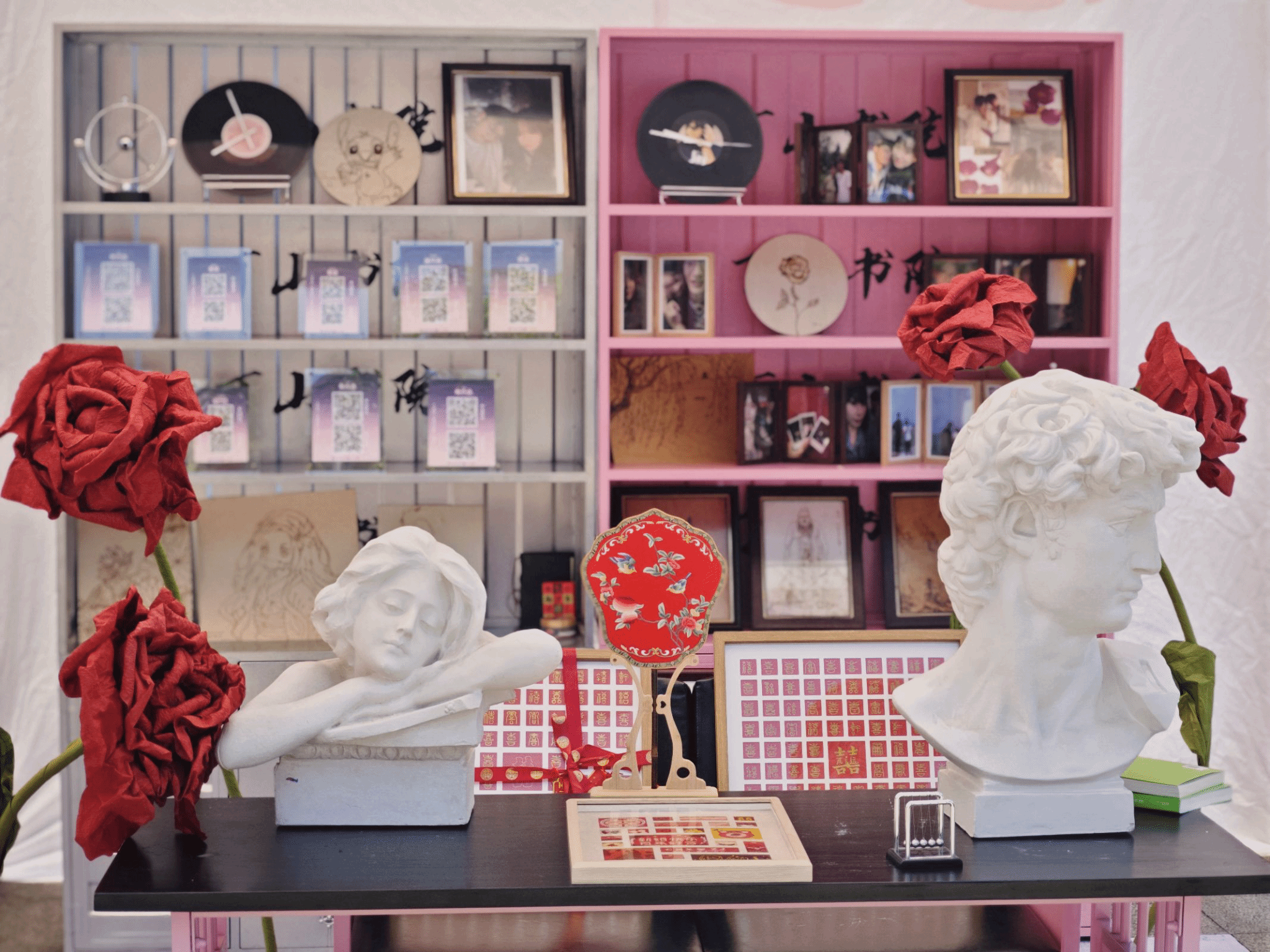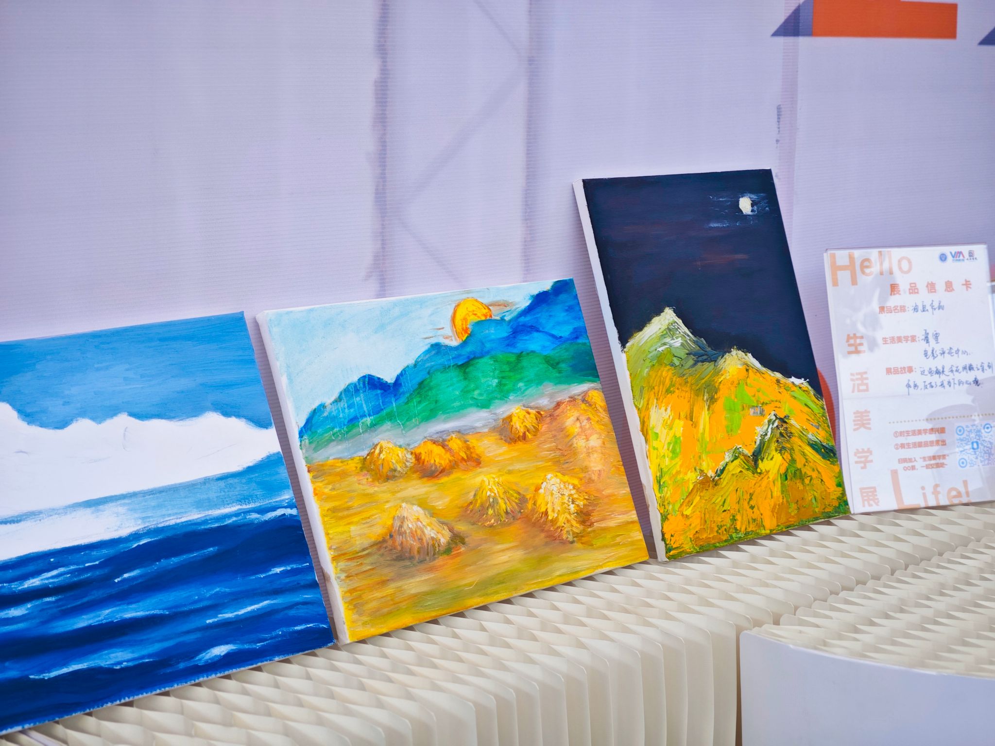 右侧场边针对8大书院特色,搭建“丁山书院浪漫主义角”“南江书院小洞天休闲空间”“瀛溪书院围炉夜话”等美学角落场景,也保留了横山书院书法角体验、綦河书院故事茶馆等社区真实生活痕迹,让书院文化以可触可感的小场景呈现。整场展览在空间扩容中实现从单一陈列到多维叙事的升级,让“生活即美育”的理念渗透于每一处展陈细节。