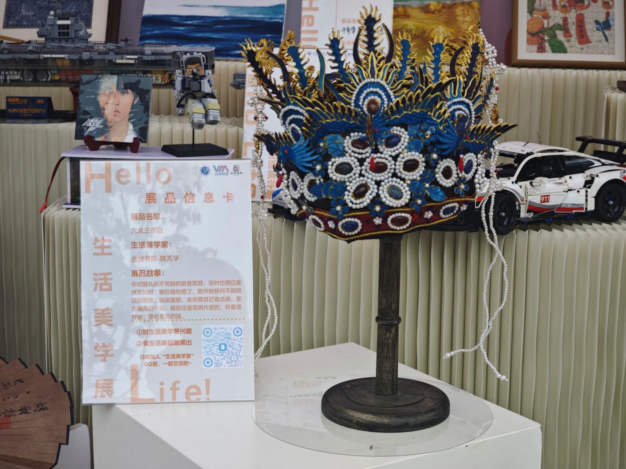 本次展览创新推出“门票即选票”的观展方式,副券可直接作为投票凭证,师生可根据现场观展感受,为“最受欢迎藏品”“最具设计感穿搭”等四大美学标签投出选票。其中,由书院老师纯手工制作的承载对婚姻幸福美好生活向往的“六龙三凤冠”以268票斩获“最具情感温度藏品”,成为连接当下与未来的美学共鸣点。