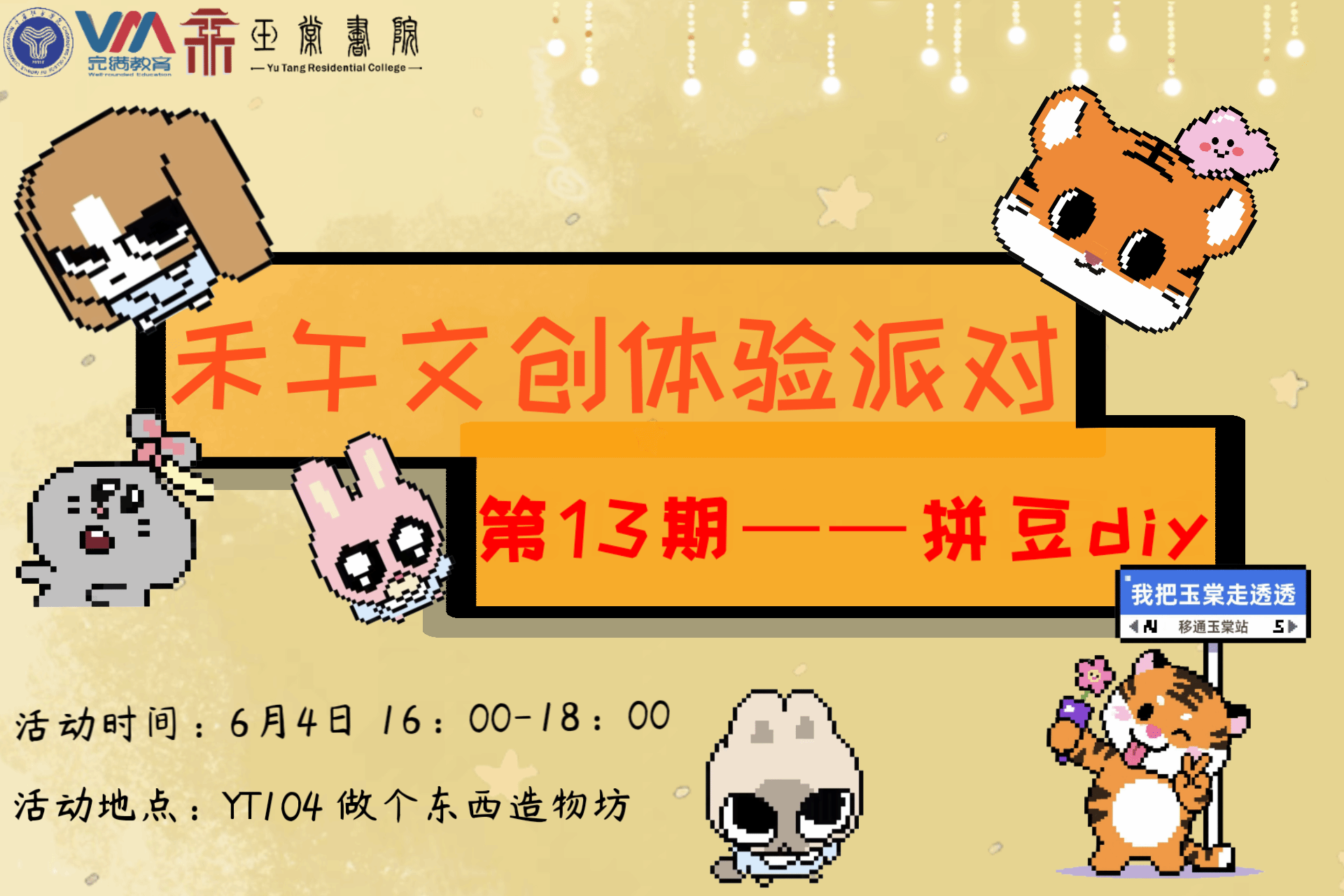 为丰富校园文化生活,推广玉棠书院IP,激发同学们的创造力与动手能力,玉棠书院联合巴别塔动漫社及禾午文创研究室工坊,开展了三期“禾午文创体验派对”,活动不仅让同学们的手指忙得不亦乐乎,更让无数天马行空的脑洞在方寸豆盘上落地生根。从呆萌像素宠物到炫酷立体挂件,每一粒豆豆都在讲述着属于青春的无限可能。