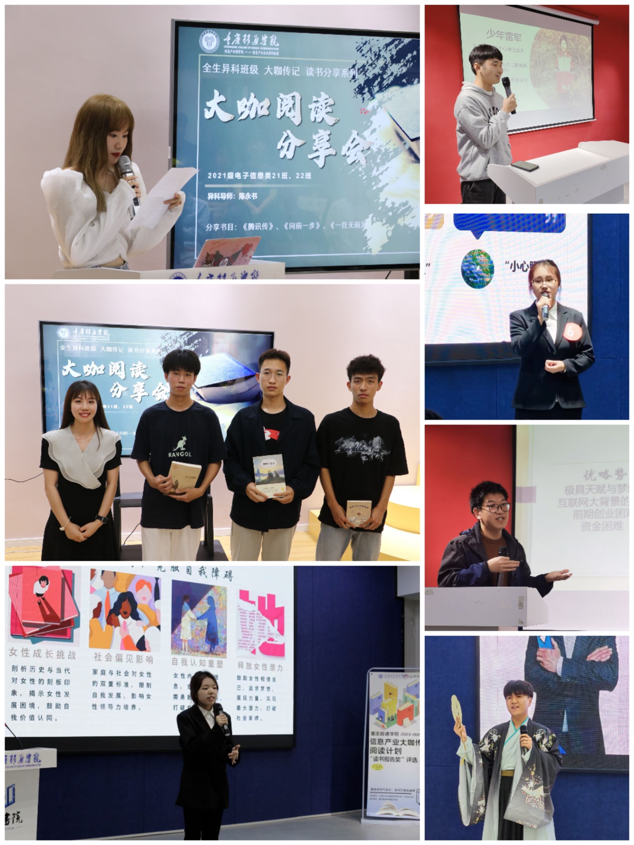 “一本好书就是一扇窗,当我们学会与伟大灵魂对话,人生便有了抵御风雨的铠甲。”如何做好“大咖阅读计划”专项工作?陈老师立足学校信息产业商学院的办学定位,以“三维进阶”的方式将同学们的商科思维培养融入大咖阅读。陈老师在班级上划分大咖阅读小组,每月辐射一个小组,每小组辐射10余名同学,确保精准指导与深度交流。初期通过“大咖手抄报创作”帮助同学们感知商科思维,并开展职业生涯规划和个性指导;中期坚持每月举办一期“读书分享会”锻炼同学们的语言表达能力,针对分享的同学,陈老师会赠送名家著作表示鼓励,至今已累计送出50余本;后期则带领学生走向校级舞台实现价值升华,指导3名同学荣获学校“大咖传记读书报告会”一等奖、1名学生获评学校“书香达人”。“大咖传记阅读”坚持的背后,同学们的认知思维、语言表达、眼界格局也得到提升,这份成长弥足珍贵。