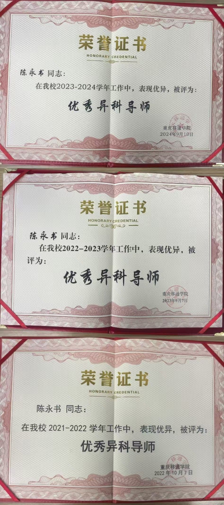陈永书,中共党员,现任学生处学生科科长,先后担任通信与信息工程学院2021级、2023级异科导师。育人七载,曾获评重庆市高校“安稳工作先进个人”、綦江区“优秀教育工作者”(2次)、学校“校区管理工作贡献奖”“优秀共产党员”“优秀行政管理人员”、“信息化建设先进个人”“优秀工会组长”等多项荣誉,连续三年获评学校“优秀异科导师”,积极指导学生参与各级各类活动赛事,多次获评“优秀指导老师”。