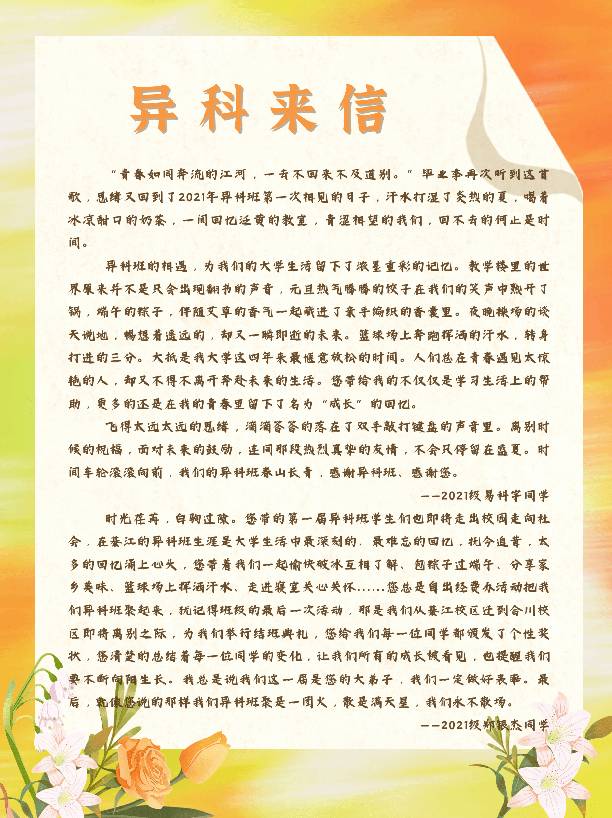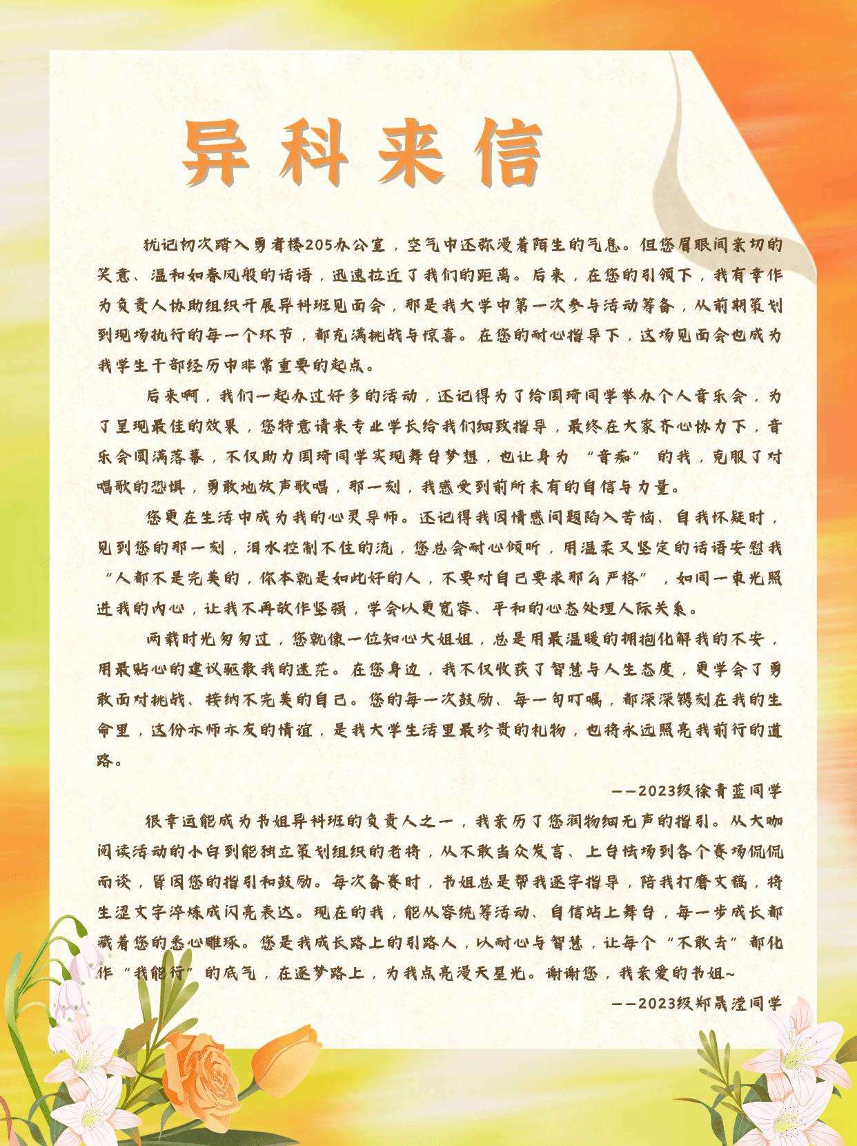 “四载异科育人经历,也是我忙碌工作里的治愈时刻,在陪伴和指导学生的过程中,我也收获了职业的幸福和价值。感恩异科,让我们遇见更好的自己。”