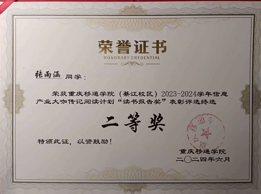 “谢谢老师,拿了二等奖!”这是6月12日,綦江校区淬炼商学院2023级的异科学生张雨涵、蒋丹两位同学发来的惊喜,他们在2024年校级信息产业大咖传记读书比赛中获得了二等奖的好成绩。初识他们:害羞、腼腆、不愿意表达,经过近一年的倾心交互,对于大一的他们来讲,虽缺乏竞赛平台的历练,但也能在众多新星里,与自己顶峰相见,作为指导教师,能看到他们得渔之法的成功,比我自己得奖更开心,更有价值感!