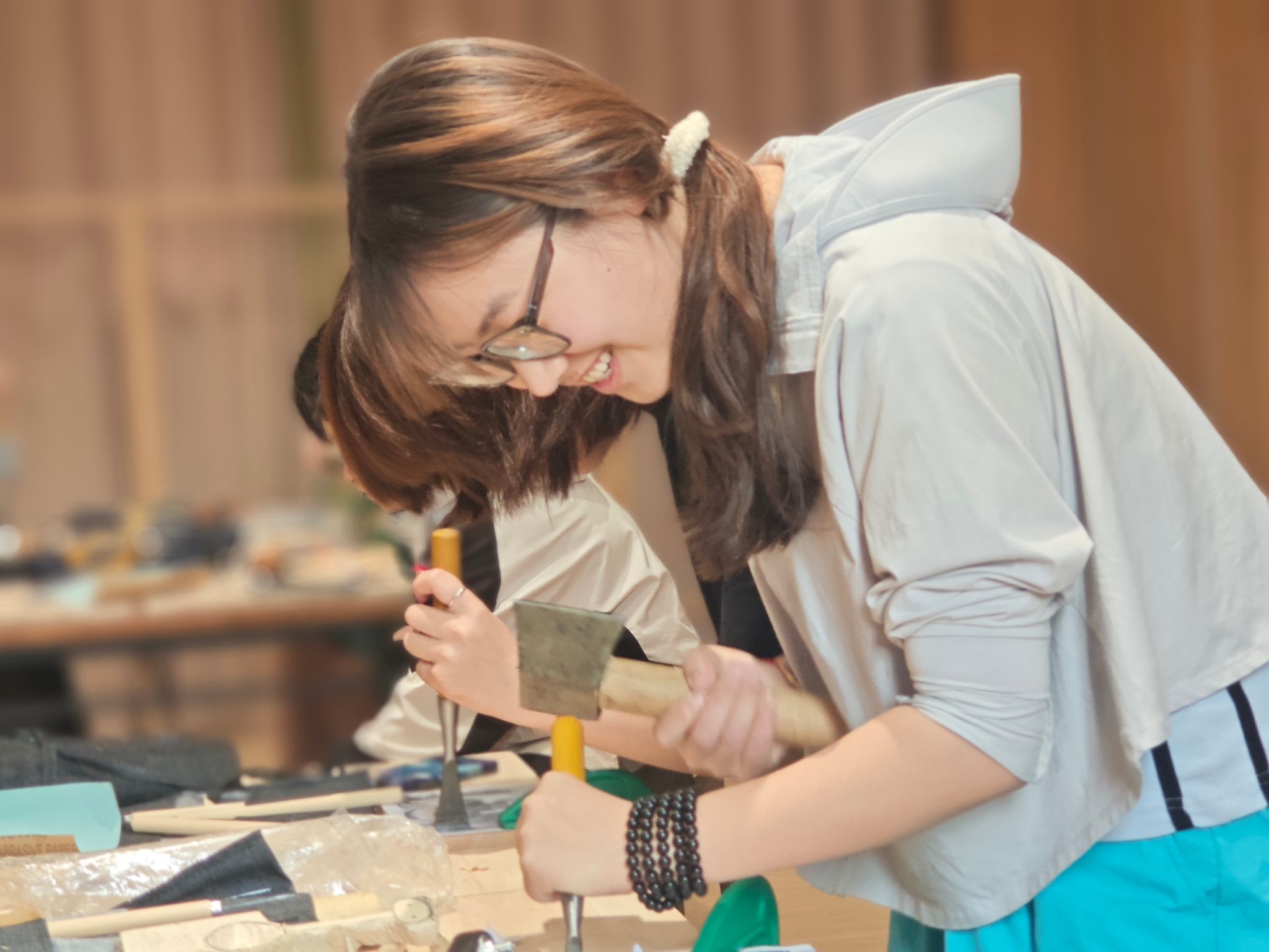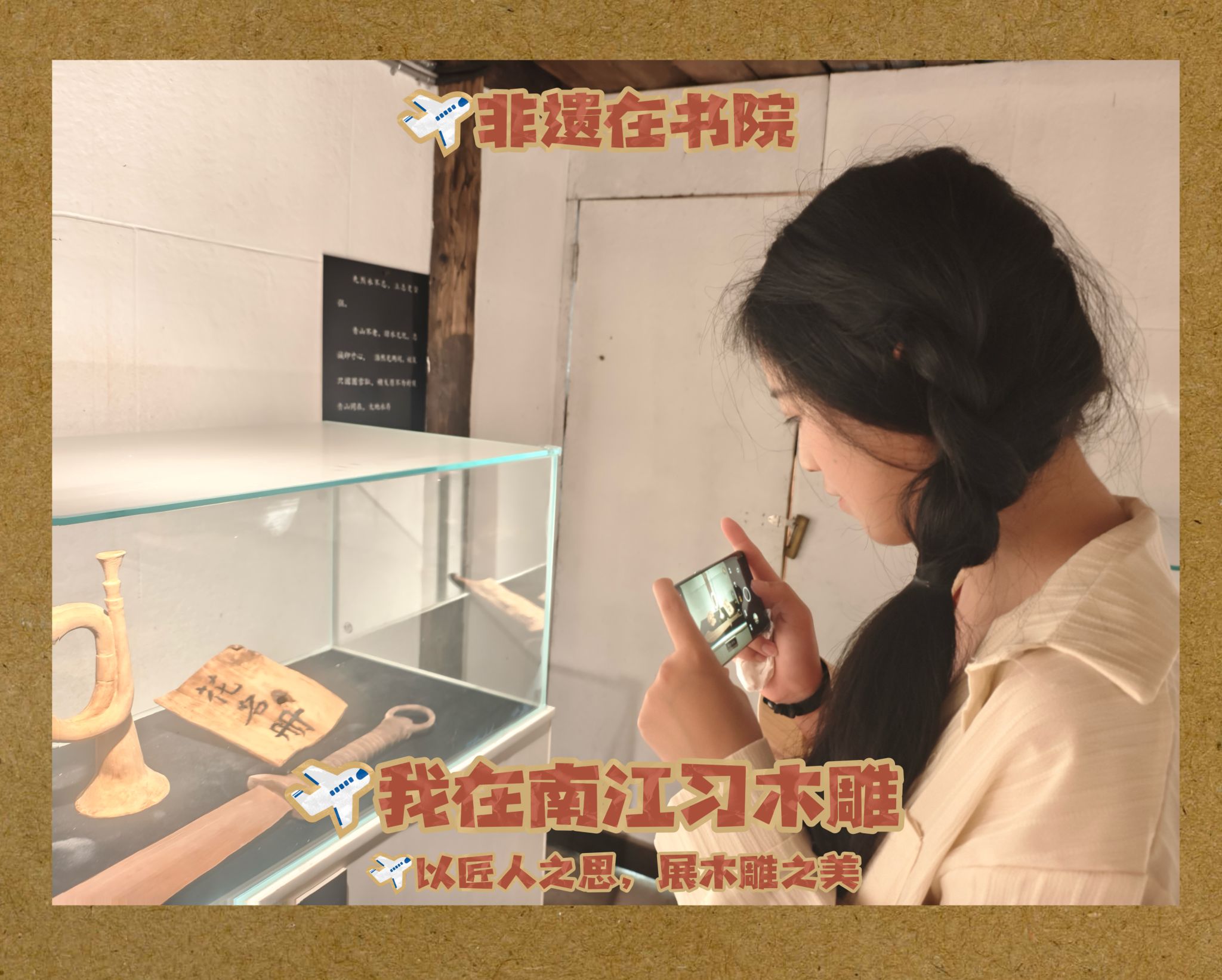 课程之余,南江书院学生发展导师带领学员前往东溪黄氏木雕情怀馆研学。馆内陈列的木雕作品线条流畅细腻,纹理错落有致。匠人以刀为笔,将艺术凝固于木材方寸之中。学员在观摩中深切感受到匠人对自然与生活的细腻观察,木纹肌理间流淌的不仅是技艺,更是创作者与万物对话的匠心。这场研学不仅叩响了学员的艺术感知力,更让“美”成为创作的起点,为后续生活化创作注入灵感源泉。