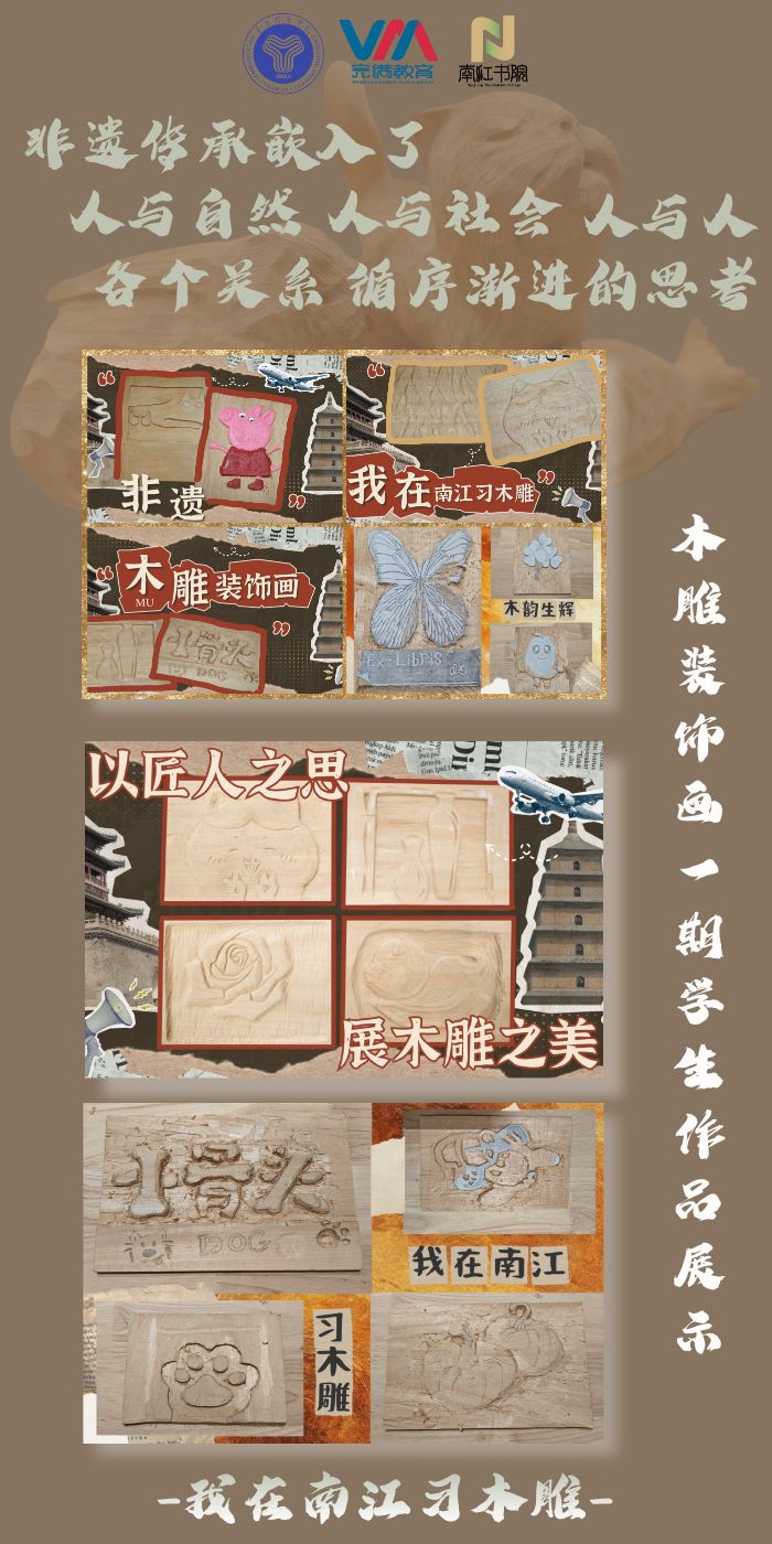南江书院特别设计了木雕展示墙,有序陈列学员作品。从早期尚显质朴的装饰画,到后期工艺逐渐成熟的实用物件,按创作阶段与类型排列。这些作品真实记录了学员在木雕学习中的成长,这不仅是学员个人技艺的成果展现,更是木雕非遗传承的生动体现。精美的图案与巧妙构思,吸引不少师生驻足。在自然的观赏中,木雕艺术潜移默化的得到传播,非遗文化的内涵也让越来越多的人有所感悟。