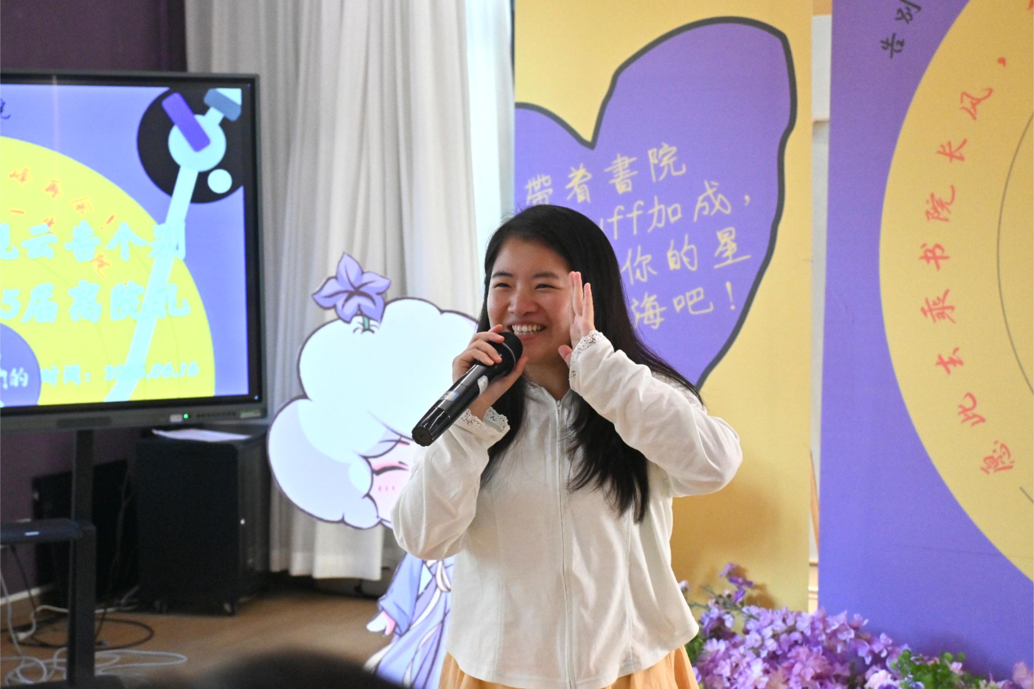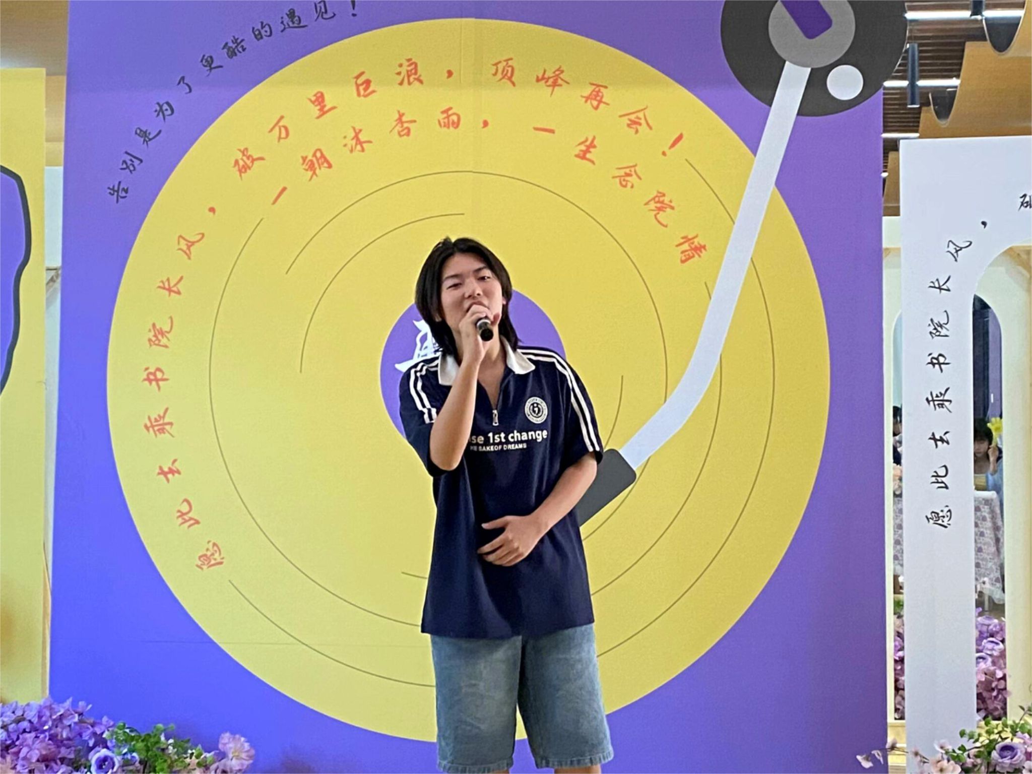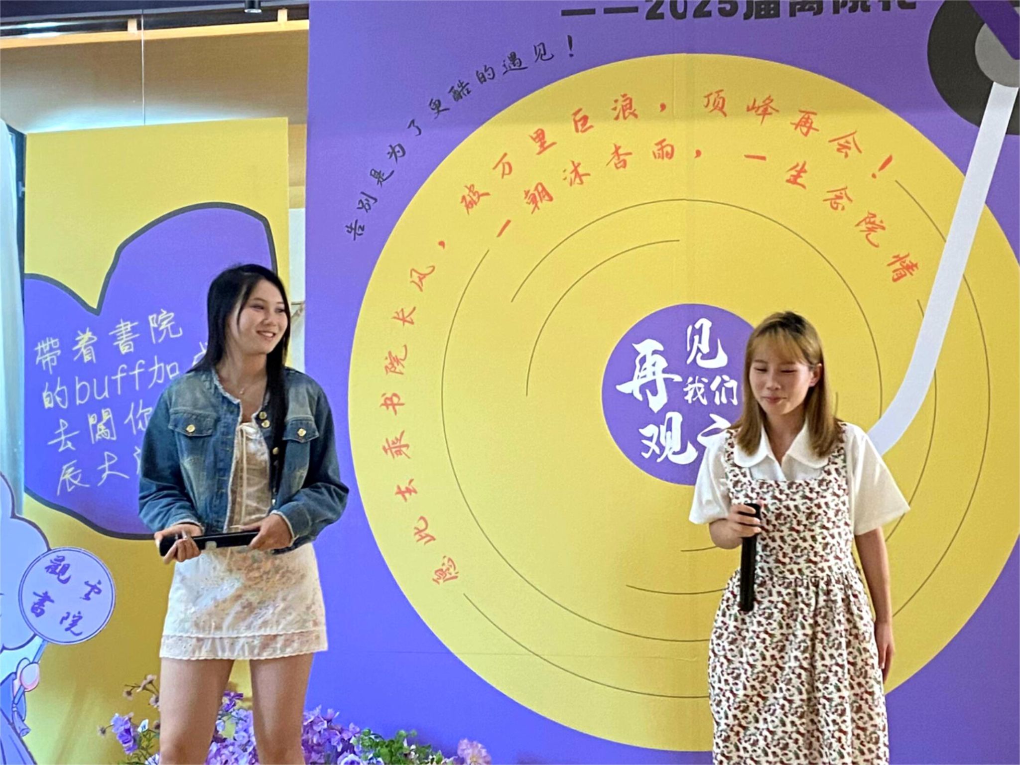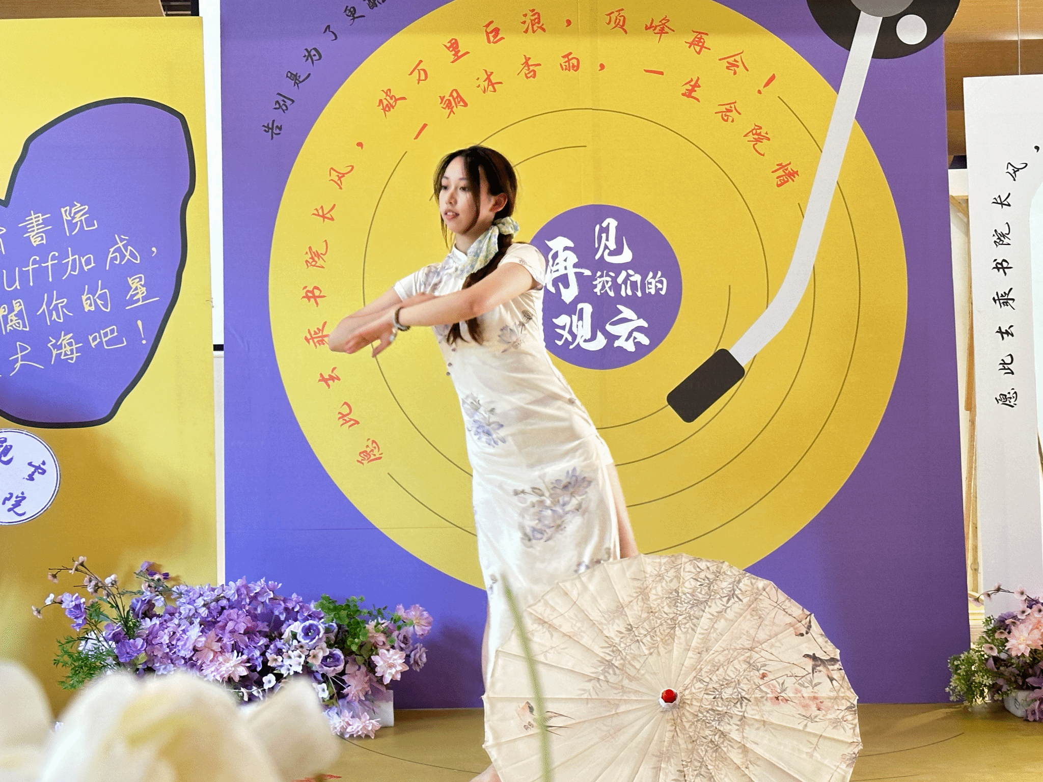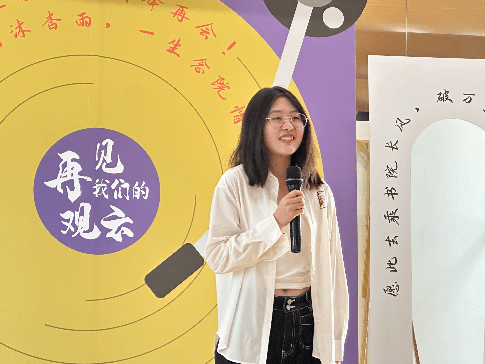 表演结束后,由观云书院学生自治委干部代表叶馨仪同学上台进行发言,她分享了自己在观云书院的成长历程和感悟,表达了对书院、老师和同学们的深深不舍。她的发言真挚感人,让在场的每一个人都为之动容。接着到了导师寄语环节,由观云书院办公室主任杜荧老师为离院学子们送上了深情的嘱托。活动最后在合影留念环节中落下帷幕,学子们留下了最灿烂的笑容,为这场难忘的盛会画上了圆满的句号。