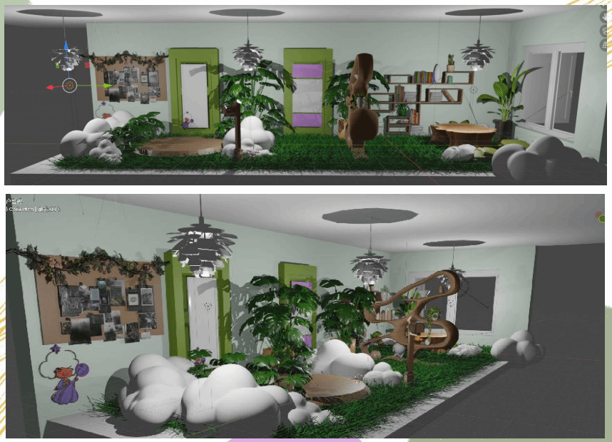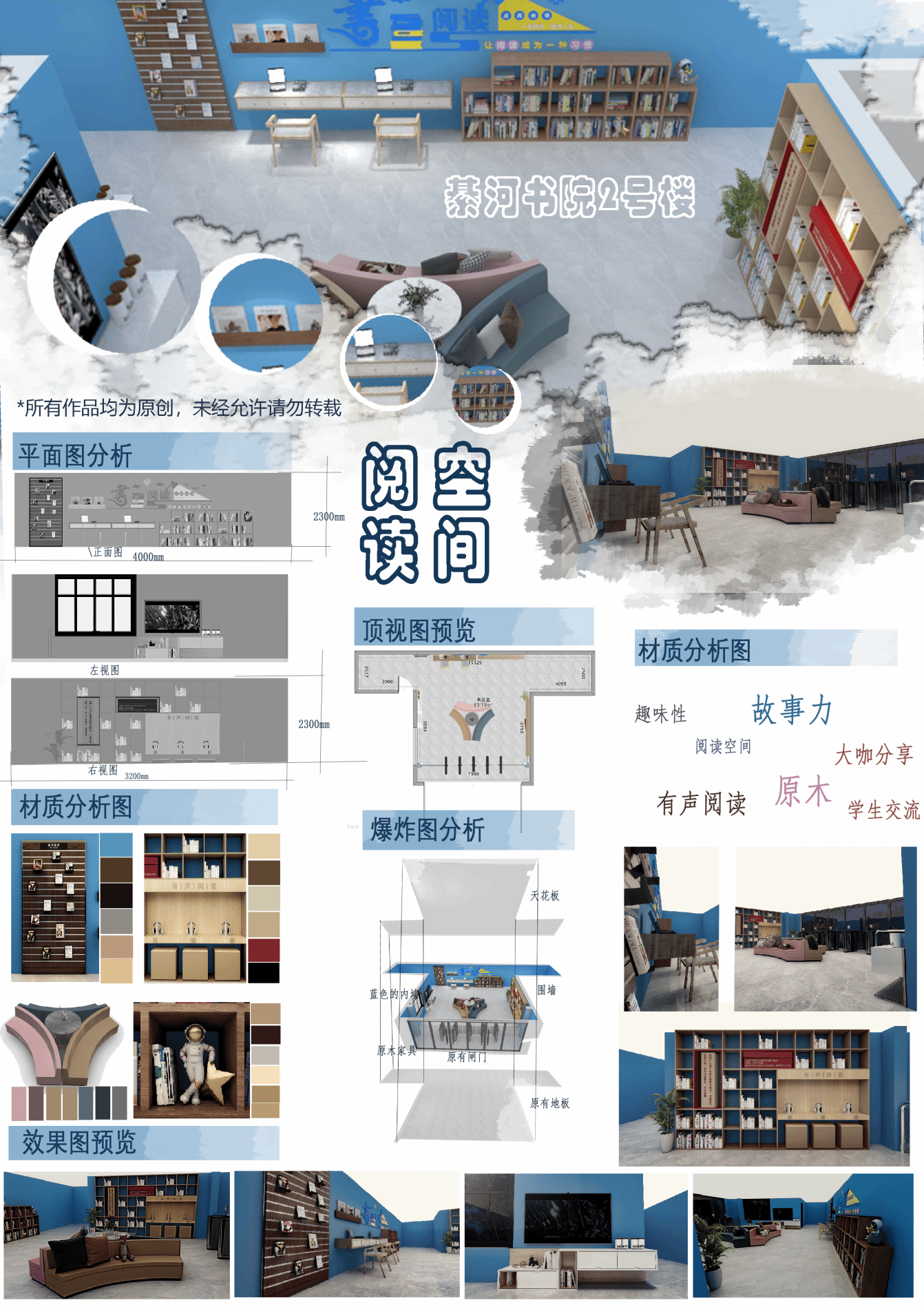 綦河书院二号楼阅读客厅:设计1234队、横山突击队,通过功能创新,设置“多元客厅角”与“故事主题架”;合理利用空间,采用立体与可移动书架,设置阅读卡座;打造集阅读、交流、休闲于一体的空间,满足师生需求,助力培养阅读习惯与“故事力”,传承书院文化。