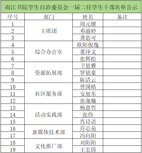 根据我校《关于重庆移通学院綦江校区各书院学生组织干部竞聘的通知》、《重庆移通学院綦江校区各书院学生组织换任的方案》《重庆移通学院綦江校区南江书院学生自治委员会学生组织候选人(预)选拔方案》有关要求,经过组织推荐、资格审查、面试、答辩演讲等环节,现将2025-2026学年南江书院学生自治委员会一届二任候选人名单公示如下:
