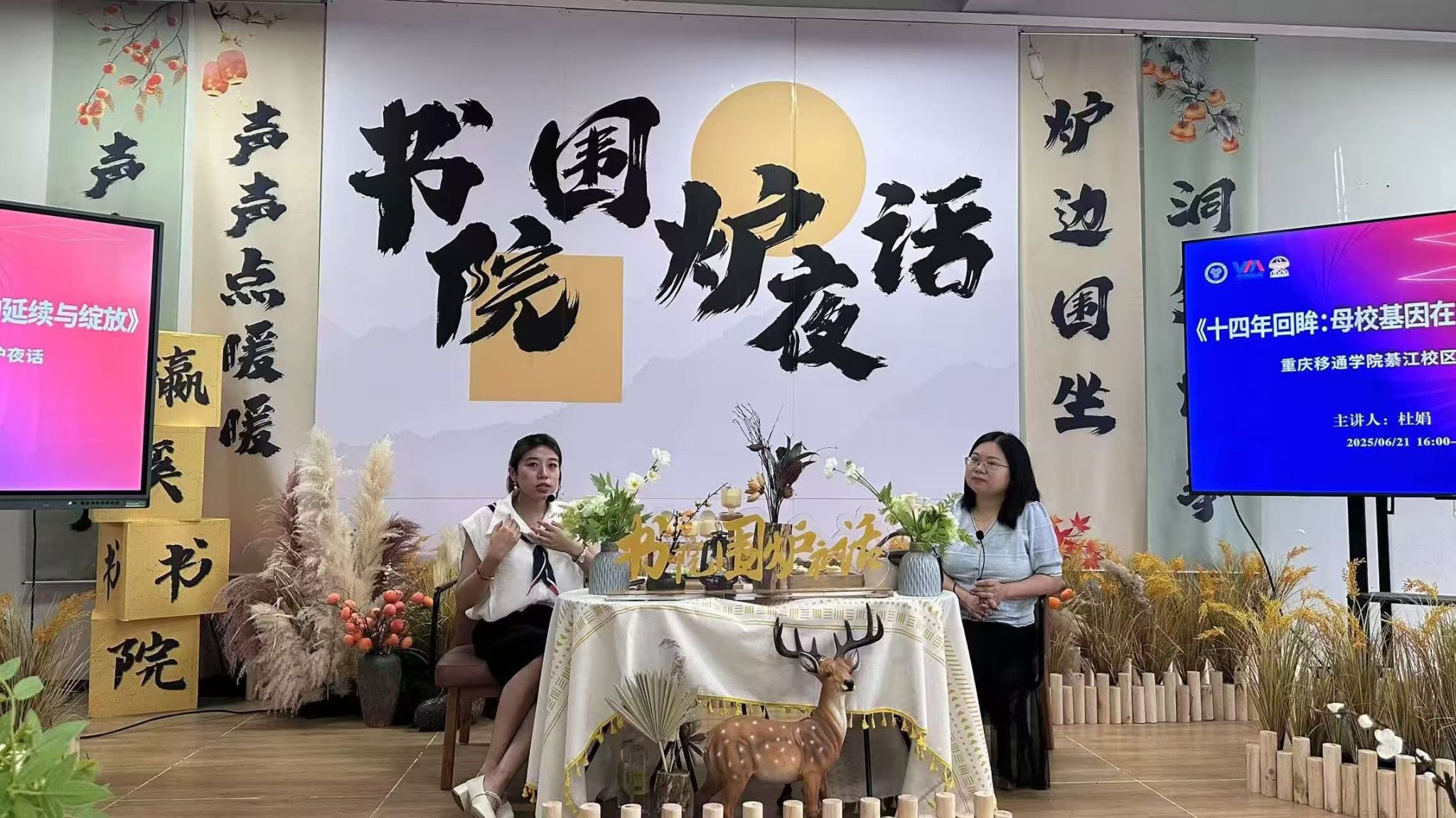 瀛溪书院和名师课堂办公室联合举办了一场以校友回到校园形式的书院围炉夜话活动。本次活动特邀杜娟担任主讲人,重庆移通学院就业创业指导与服务中心副主任毛敏作为对话嘉宾,与众多来自不同专业的学子齐聚一堂,共同开启这场思想盛宴。