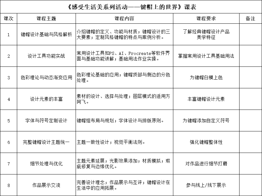 从设计基础到细节优化,如何将课程模块化是“键帽美学设计坊”需要重点突破的第一个难关。通过反复模拟调整,依托项目活动输出8期SOP标准活动课表,如游戏闯关般层层进阶,构建起覆盖理论认知、技能实训、创意落地的体系化课程设计,标准化、模块化的学习模式让成果转化质量更符合预期。