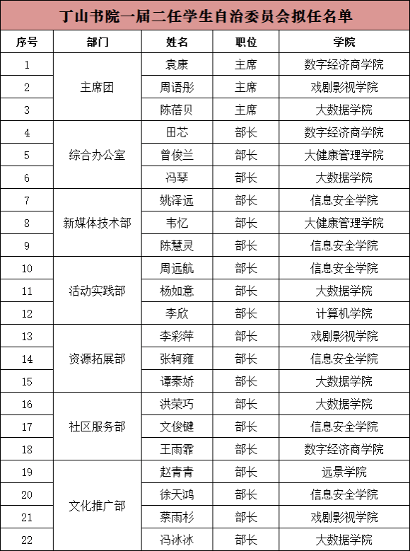 根据我校《关于重庆移通学院綦江校区各书院学生组织干部竞聘的通知》、《重庆移通学院綦江校区各书院学生组织换任的方案》《重庆移通学院綦江校区丁山书院学生自治委员会学生组织候选人(预)选拔方案》有关要求,经过自主报名、组织推荐、资格审查、面试答辩、集体评议等环节,现将2025-2026学年丁山书院学生自治委员会一届二任拟任名单公示如下: