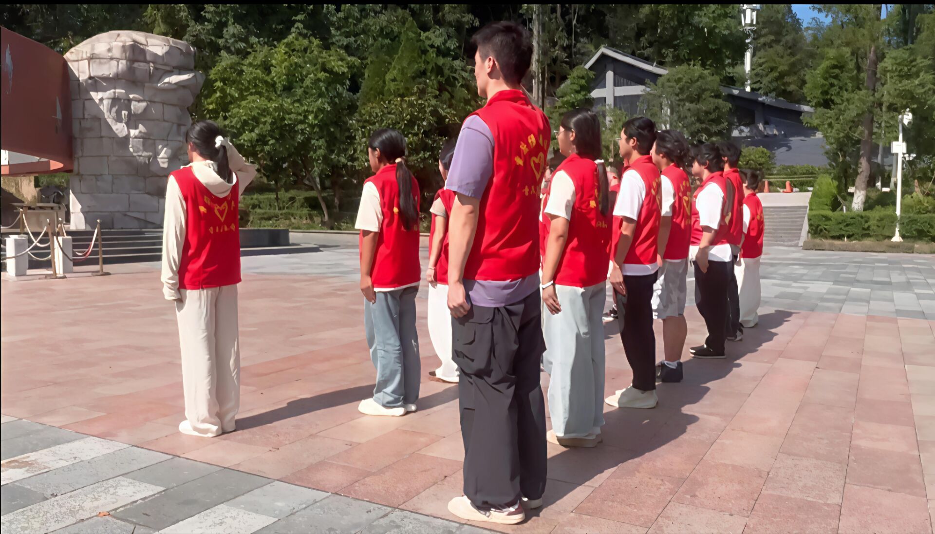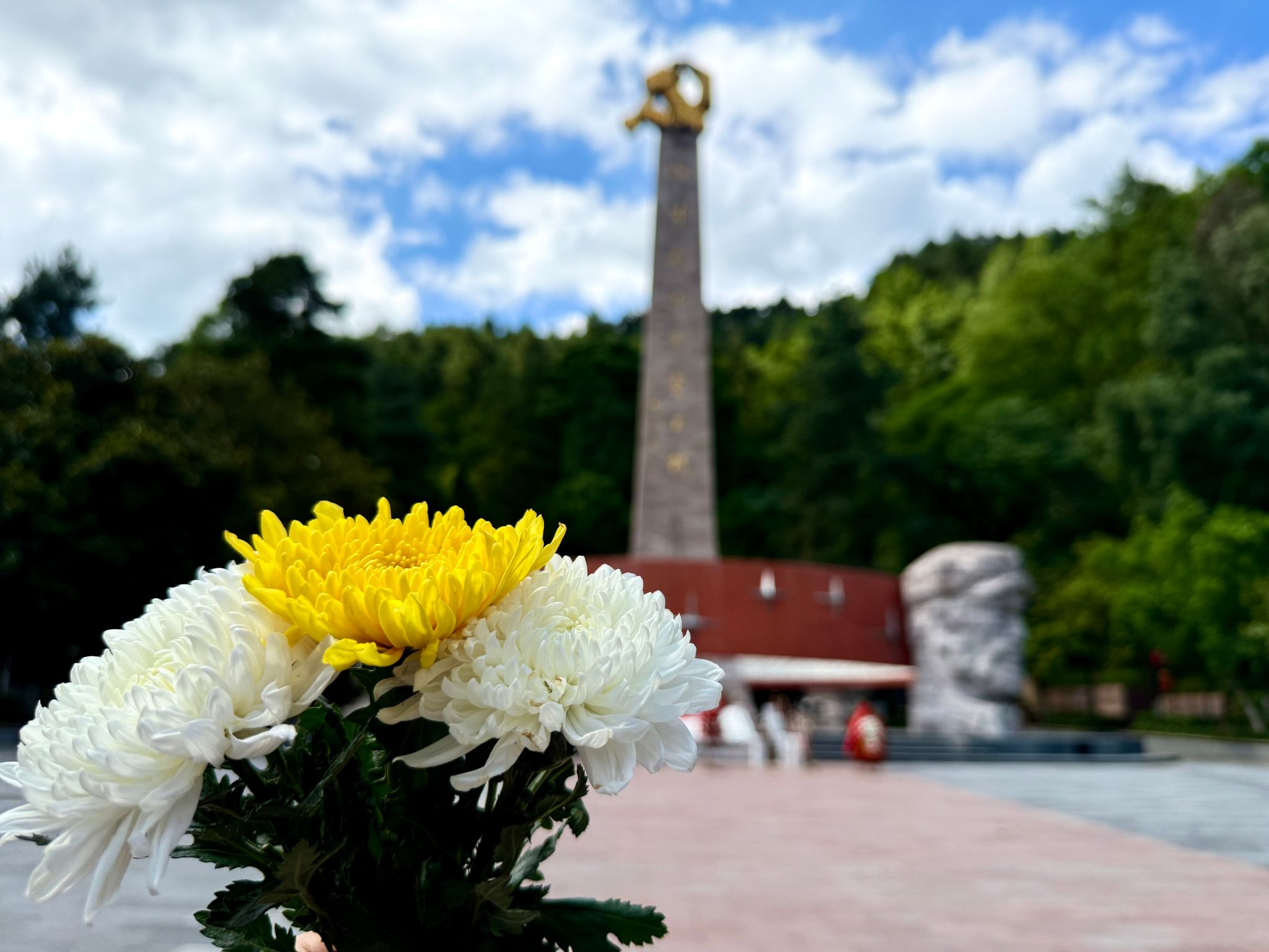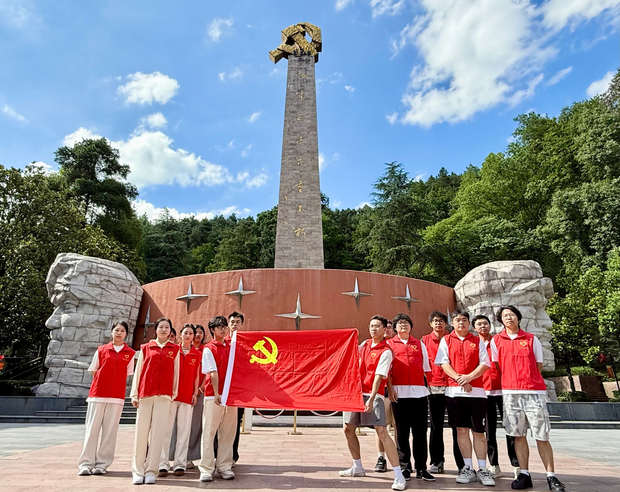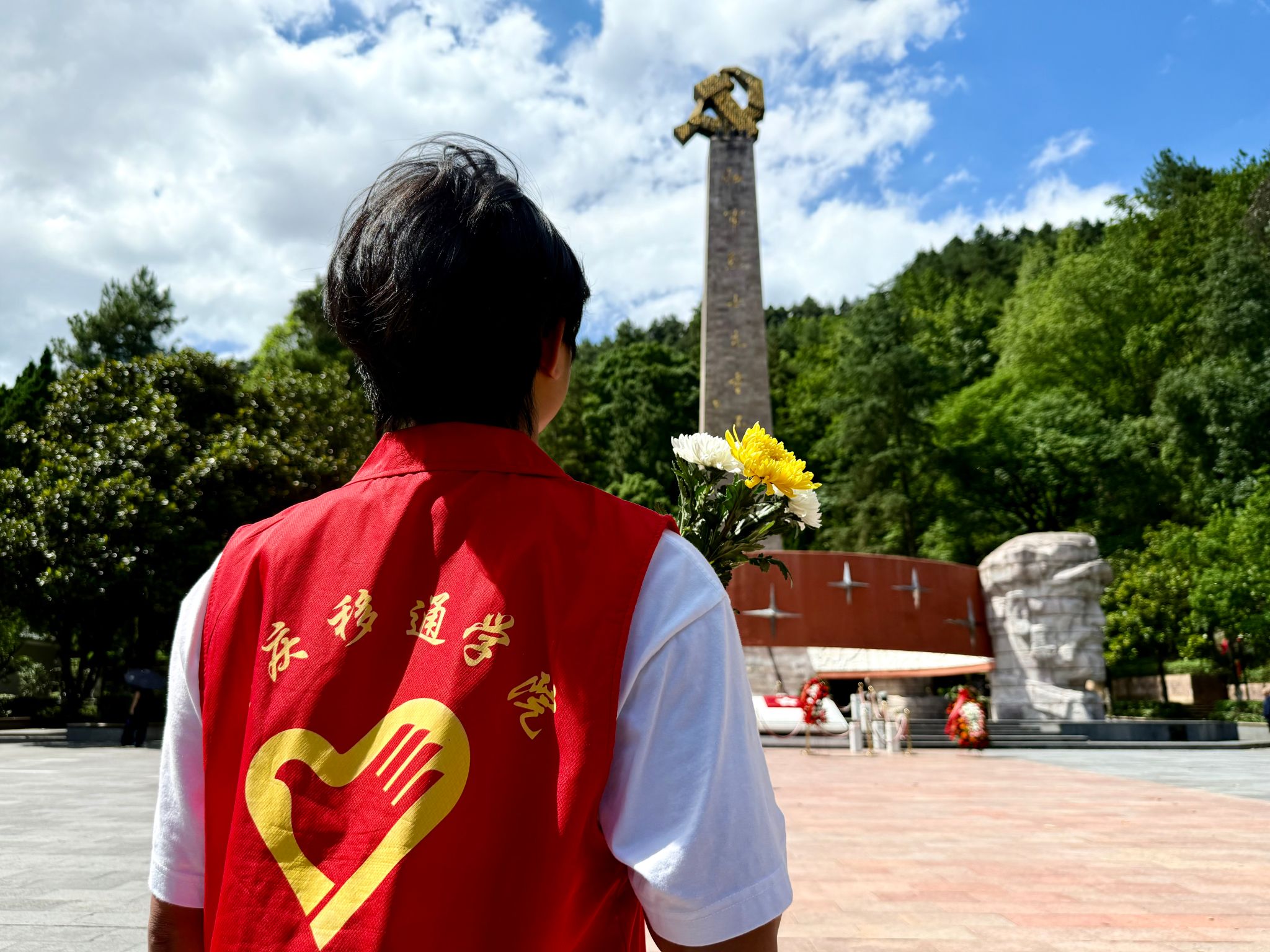 团队肃立于庄严肃穆的红军烈士陵园,四周松柏苍翠,气氛凝重,仿佛能听见历史的回响。在巍峨的纪念碑前,学子们整齐列队,神情肃穆,代表们举着花束走向纪念碑基座,将菊花轻轻放下,每一朵鲜花都承载着对革命先烈的深切缅怀与崇高敬意。