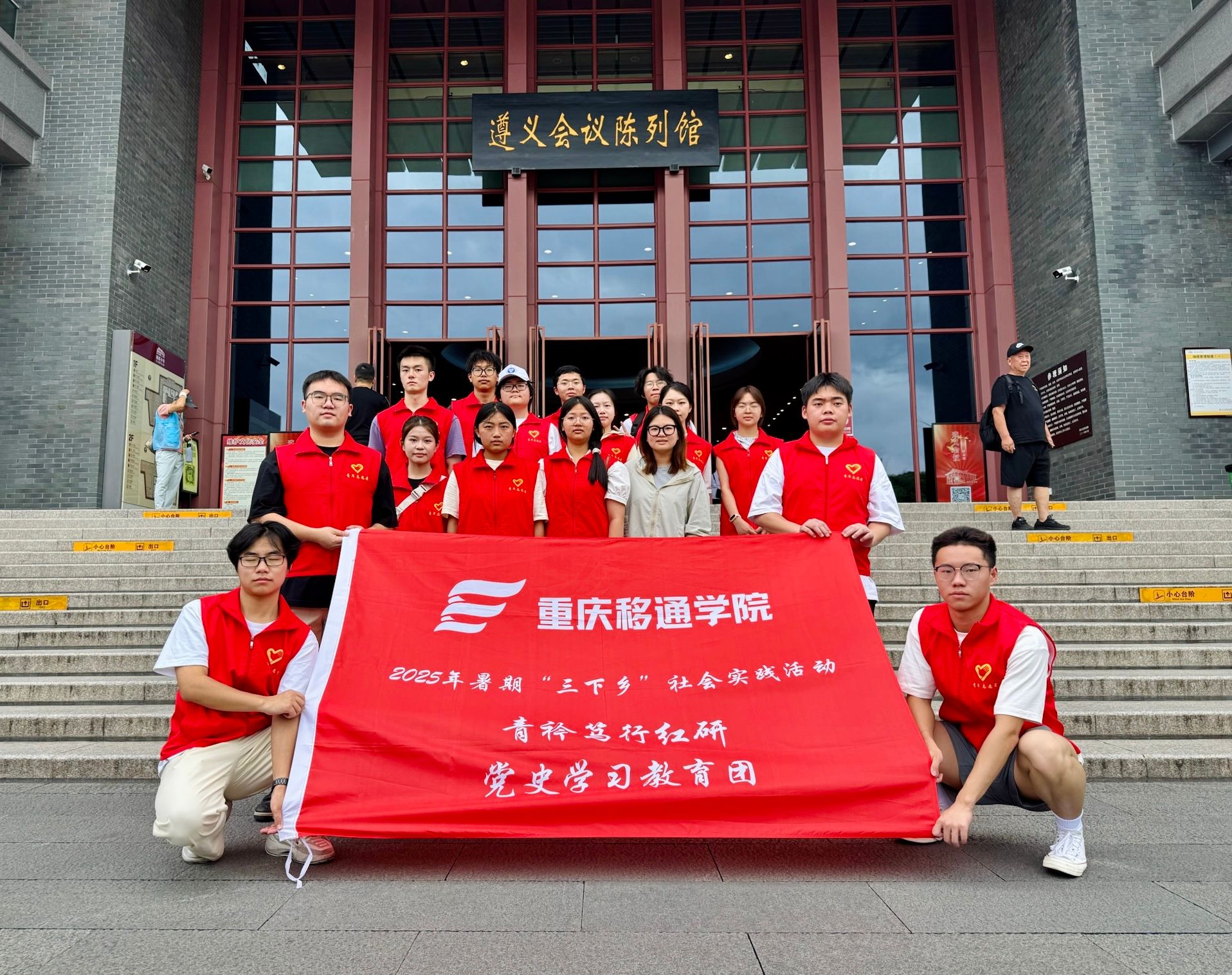 为深入贯彻党的二十大精神,积极响应国家关于加强青年思想政治教育、推动红色基因传承的号召。2025年7月3日,重庆移通学院南江书院和瀛溪书院青衿笃行红研党史学习教育团“三下乡”实践活动正式拉开帷幕。19名师生跨越800公里奔赴遵义,此次实践紧扣“四位一体双院制”育人理念,将南江书院“明辨笃行”的治学精神与瀛溪书院“前瞻致远”的创新思维相结合,青年学子在实践中“受教育、长才干、作贡献”的生动体现,展现了新时代青年学子的责任与担当。