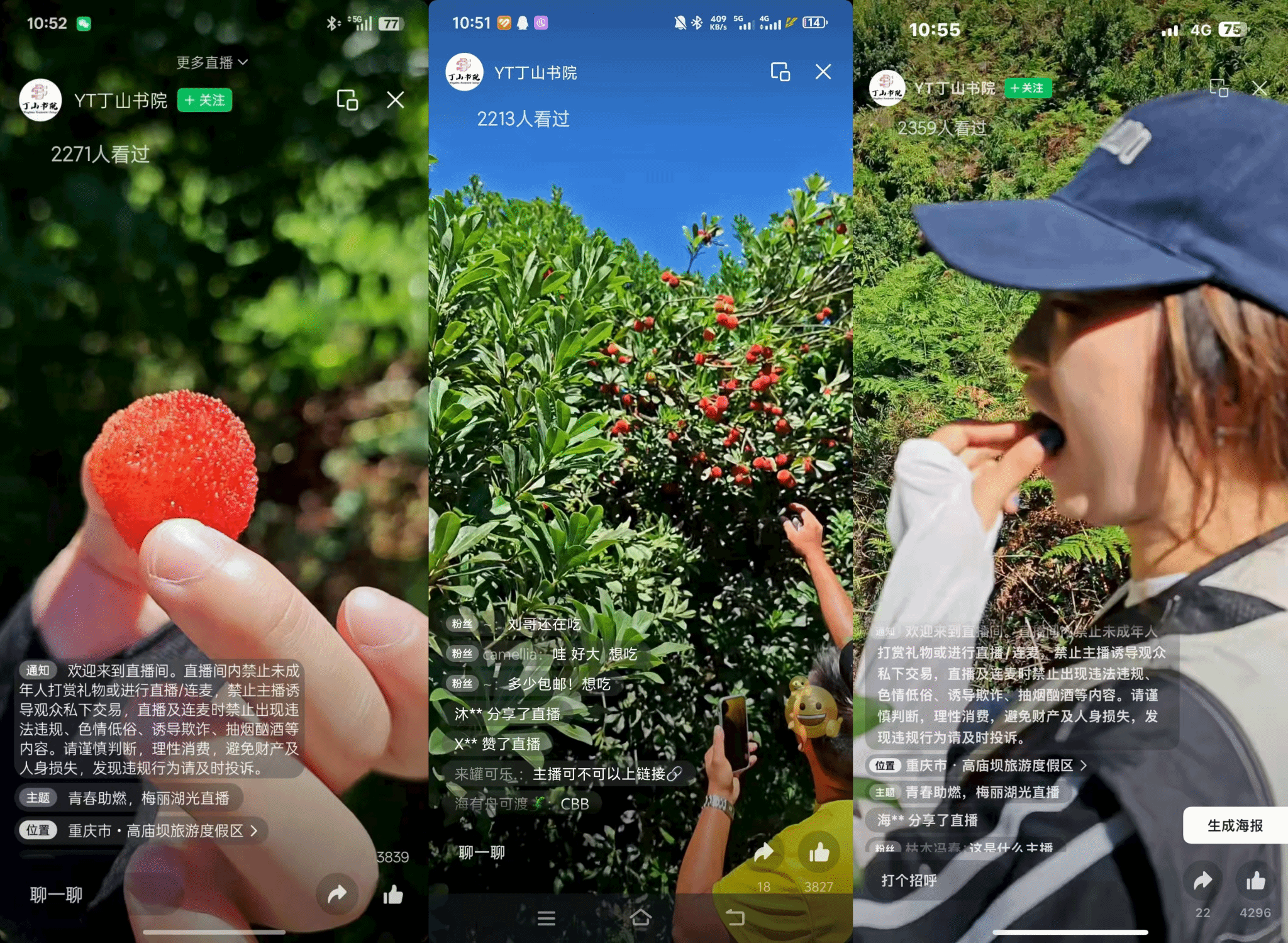 促进团开启狸狮杨梅直播带货教学模式,化身为“新农主播”老师,手持专业拍摄设备,穿梭于杨梅林间。镜头里,一颗颗鲜红饱满的杨梅挂满枝头,“老师们”一边教果农将种植故事转化为消费者购买欲望,一边亲手采摘、试吃,向网友全方位展示“狸狮杨梅”的品质与风味。截至直播结束,微信视频号累计点赞突破3000次,30分钟累计达成50千克销量订单,辐射人群主要为重庆市本地居民。虽非“爆款”,但也初步构建狸狮杨梅与外界互动的传播平台,也为果园后续的直播传播提供流量运营方法与宝贵的直播经验。