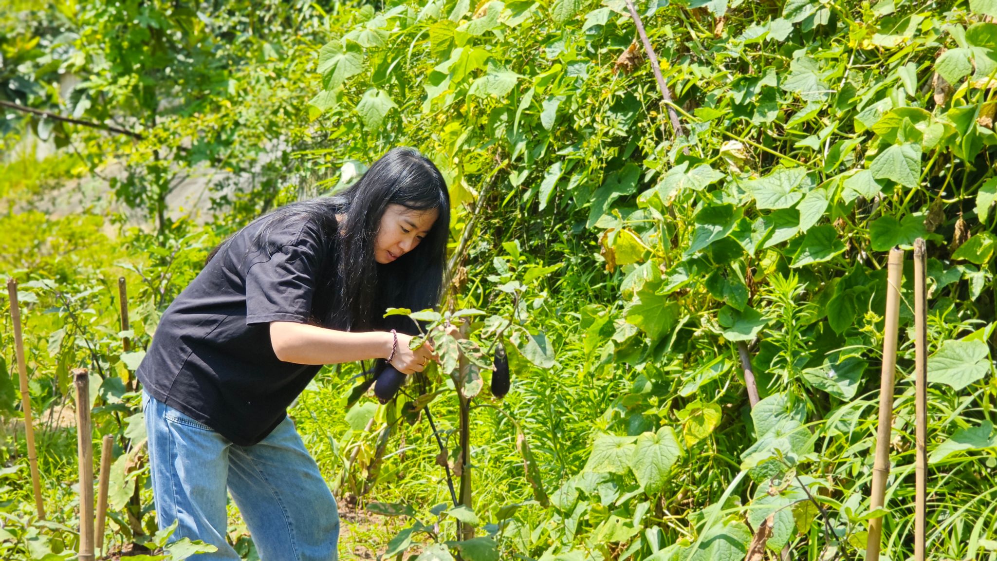 2022年10月,73棵茶树在玉棠书院的棠前茶园土地上扎下根须,标志着劳动教育的种子在重庆移通学院正式萌芽。面对板结的土壤与丛生的杂草,学子们挥动锄头,在烈日下深翻硬土,用汗水浇灌出第一课“扎根”的领悟。随着更多师生加入,整地、增肥、引渠等系统性工程让荒地焕发新生。在具有几十年耕种经验的綦江区本地农户指导下,师生共同栽下茄子、辣椒、西瓜等作物,从育苗覆膜到搭架引蔓,每一寸生长都凝结着劳动的智慧。而今,基地迎来累累硕果:紫莹的茄子、宝石般的番茄、圆滚的西瓜,沉甸甸地缀满枝头。少年们弯腰采摘,篮筐渐满,泥土的芬芳与丰收的欢欣在夏日骄阳下交织成诗。