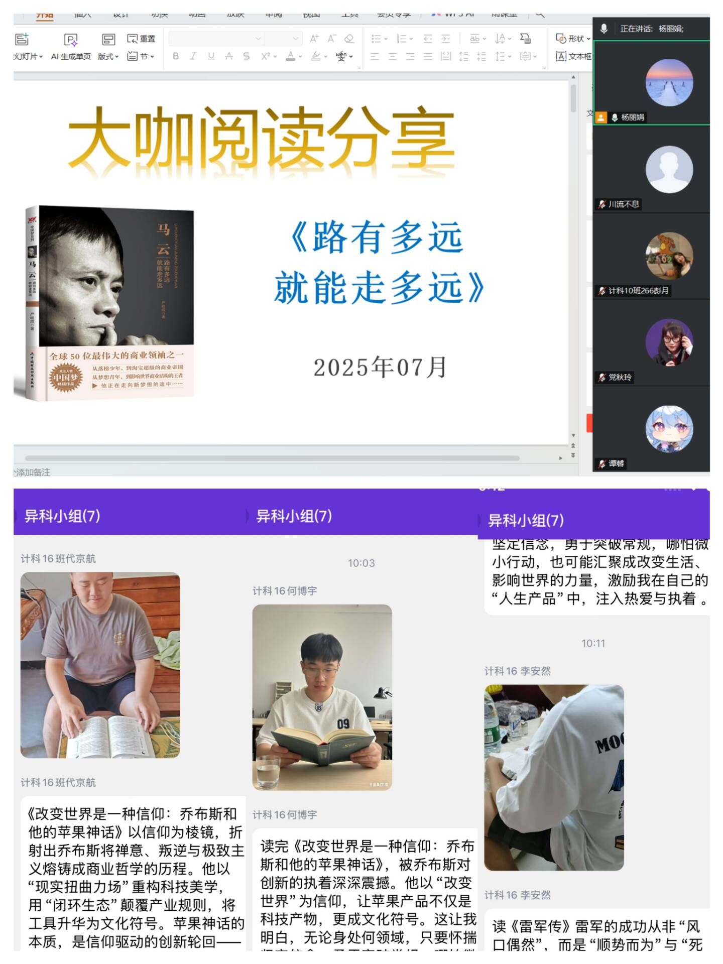 (大健康管理学院)盛夏七月,书香依旧,大健康管理学院持续推进信息产业大咖传记阅读计划,营造浓厚的学术氛围和阅读风气,增强师生跨学科交流与创新能力。暑期中,学院异科导师以线上交流或自主阅读的形式深入开展大咖传记阅读活动,共举办6场分享交流会,覆盖786人次。活动中异科导师分别围绕不同的书籍展开探讨,同学们也在线上积极参与、踊跃发言,不仅分享了对大咖传记的理解,还结合自身专业畅谈对大健康产业与信息技术融合的见解,展现了同学们扎实的阅读功底和深刻的思考能力。