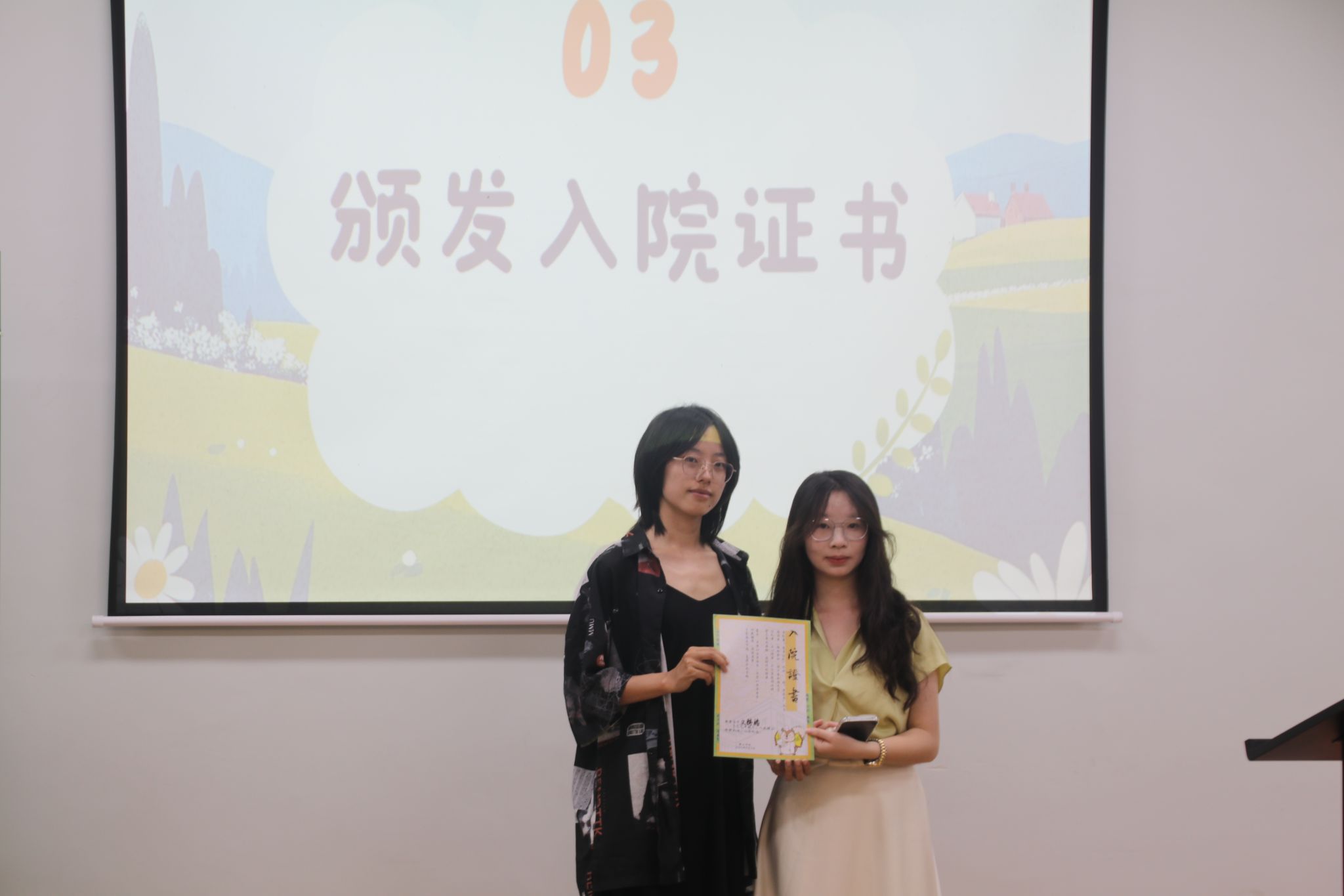 在新生代表发言环节,邀请了2025级横山书院、计算机学院的文婷椿同学分享自己的感受。她结合初入书院的所见所闻,畅谈对横山书院的初印象,同时分享了快速适应大学生活的小妙招,鼓励在场新生积极参与书院活动、主动结识伙伴,共同在书院这个“大家庭”中成长进步。在新生代表分享结束后,为进一步提升新生的仪式感与荣誉感,仪式设置了颁发入院证书环节。横山书院学生发展导师杜曦雅老师为参与新生颁发其亲手设计的入院证书,在手与手的传递、心与心的贴近中,有效削弱了书院学子初入大学的陌生感,让大家深刻体会到成为书院一份子的责任与幸福。