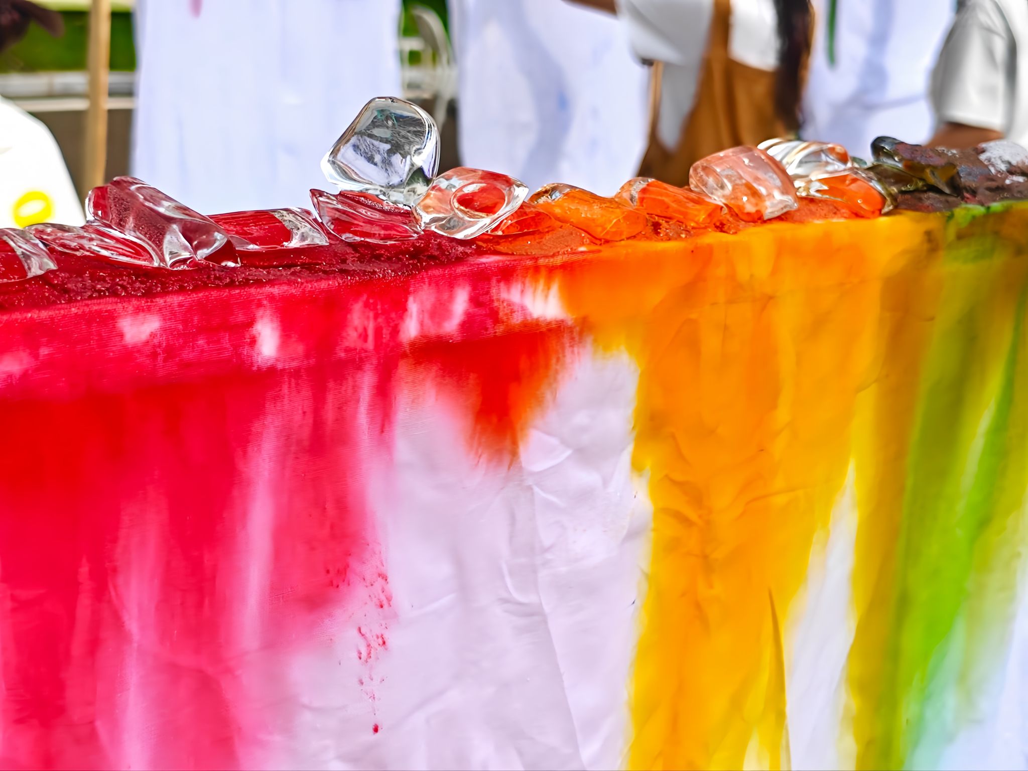 作为传承已久的非遗工艺,冰染以“冰为媒、染为魂”,将自然肌理与手工创意巧妙融合。活动开场,主持人便化身“冰染向导”,既讲解文化渊源,又拆解工艺细节,染料当撒得疏密有致,红与蓝轻叠成紫,黄与红交融为橙,才会生出“浓淡相宜”的意境。