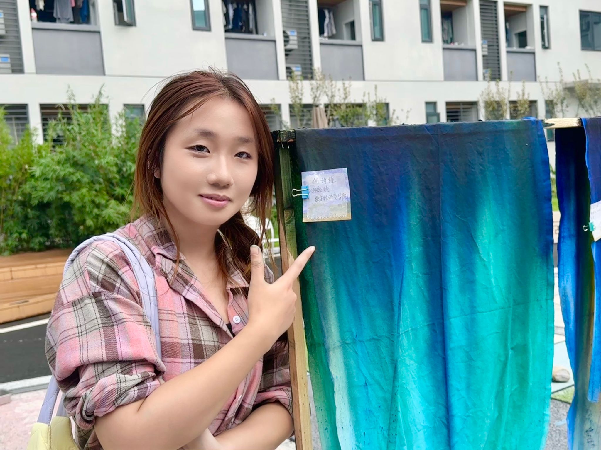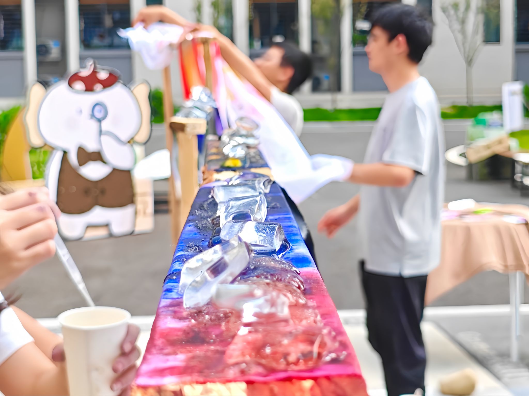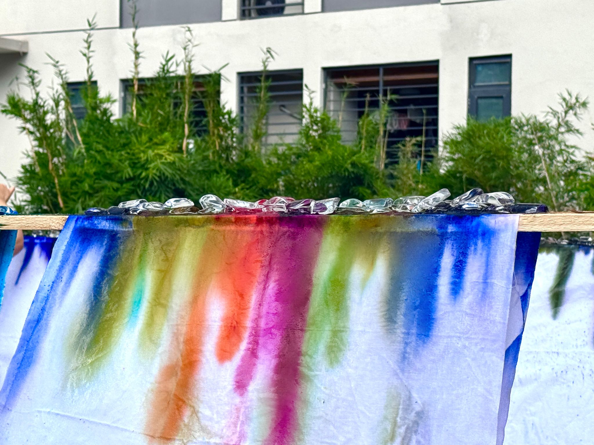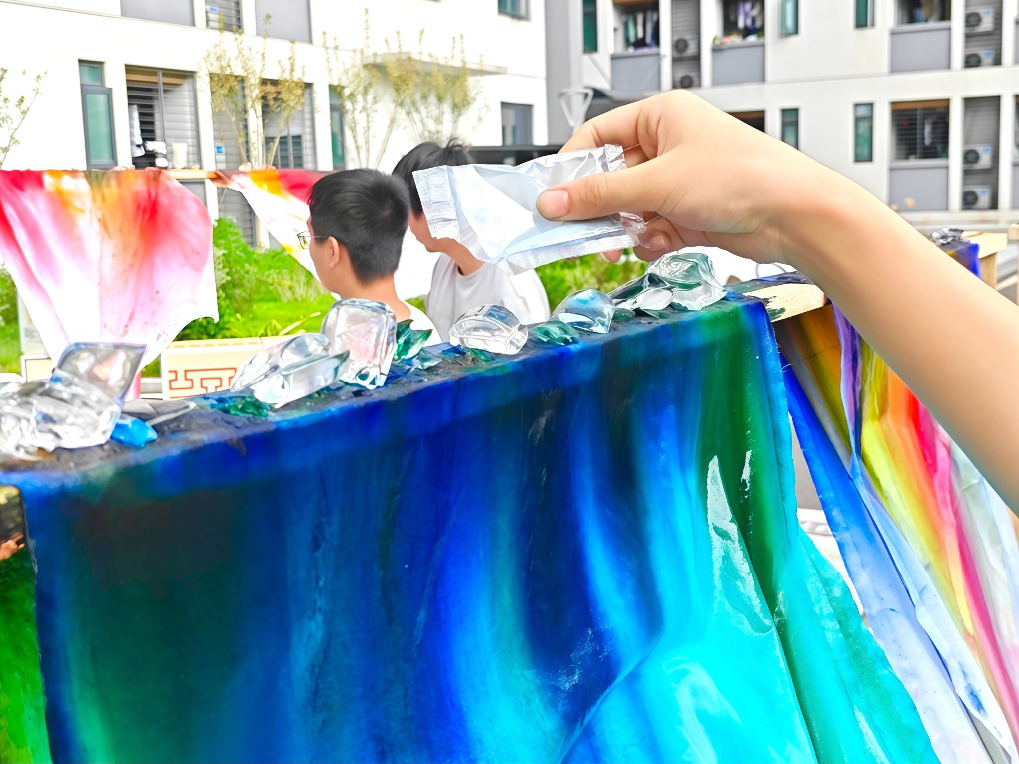 随着冰块消融,低温让染料不再肆意扩散,而是顺着冰水的流向缓缓渗透,在布料上晕出深浅交错的纹路,每一块布料都因冰的消融轨迹与染料的洒落程度而独一无二,成为“自然与创意共舞的独版作品”。创作期间,大家不时互相交流技巧,“你看我这样撒染料,会不会颜色太浓?”“你的冰块铺得真均匀,能教教我吗?”现场氛围热闹又温馨。