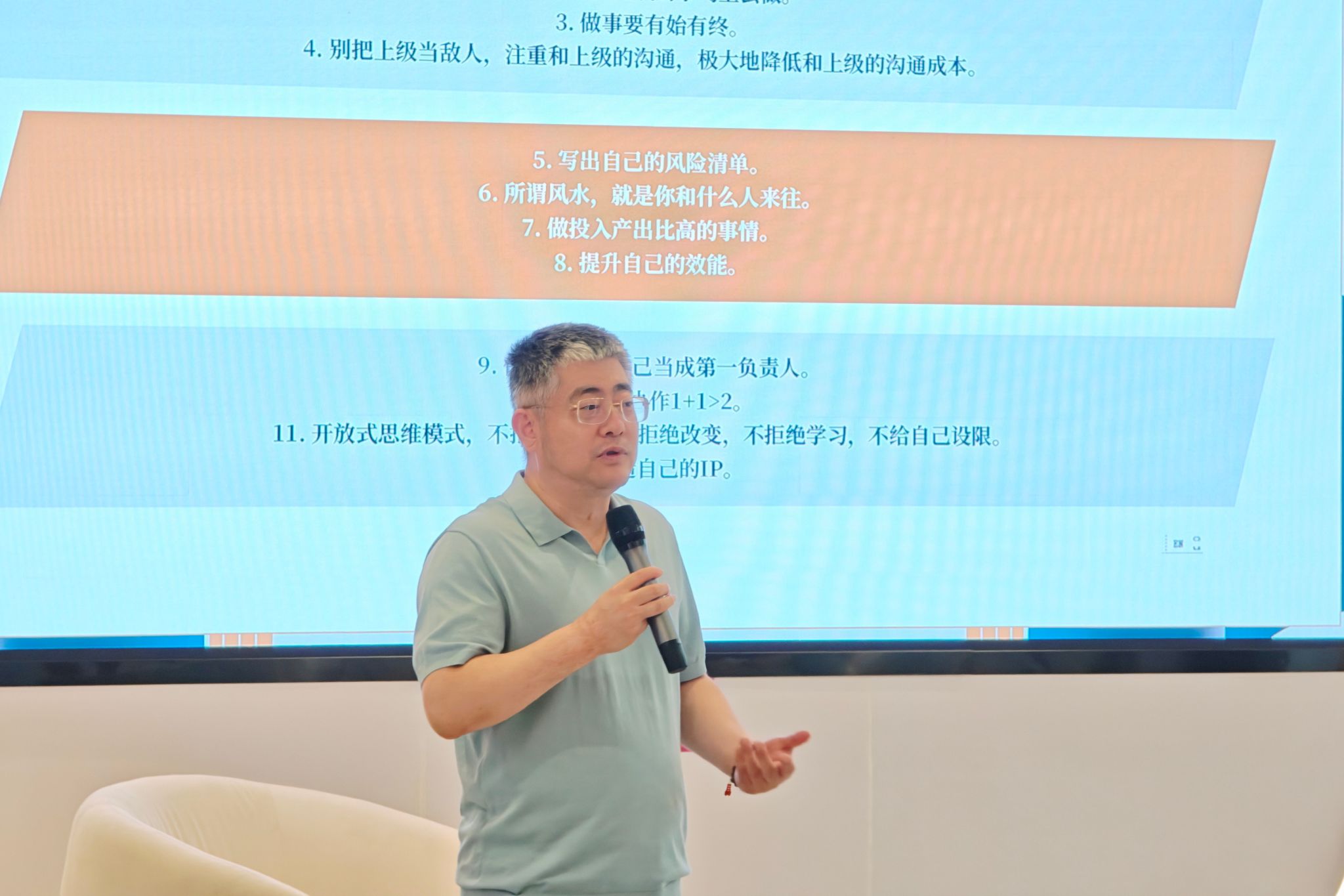 他告诉大家,要明确自己的目标,目标越明确,成功的几率就越大,注意力在重要的事上,水滴就能石穿;遇到一分钟能完成的事,要即刻行动且做事要有始有终,学会轻装上阵,不管多么困难也要把事情做完;与上级交流时,别将对方视为对立一方,把上级当老师,把伙伴当战友。接着,院长进一步提到,要提前罗列可能遇到的风险做个风险清单,我们要找朋友,而不是交朋友,要找优秀的人做朋友;要优先选择付出能带来更多回报的事以提升做事效率,无论何时都要把自己当作事情的第一负责人、领导者;在与人合作时,要懂得团结的力量,就像西游记中唐僧带领着他们的团队最终取得了成功;同时,思维不能局限,善意对待批评、主动改变与学习,不自我设限,最后还要打造属于自己的独特标识,让自己在成长中更出彩。