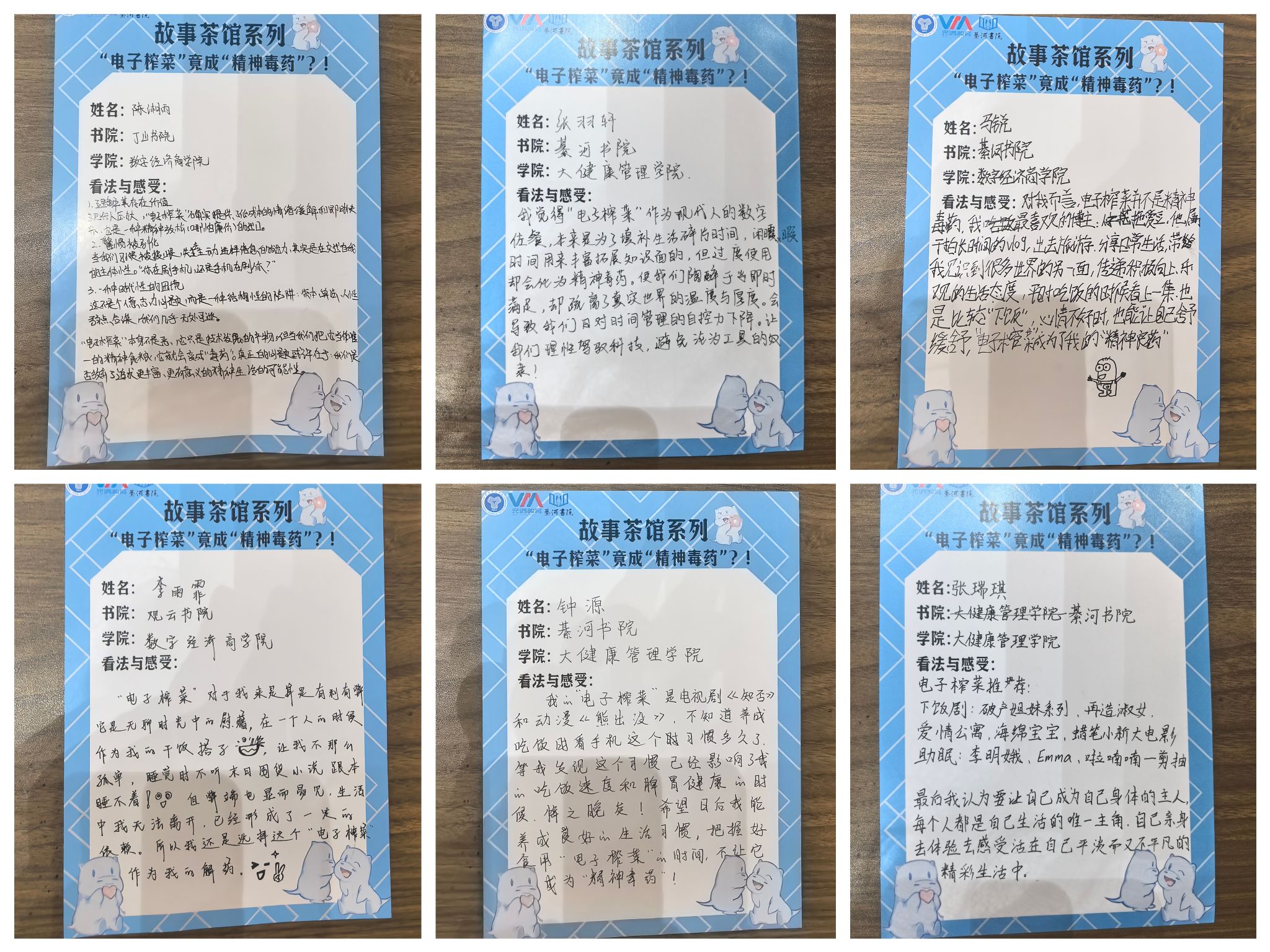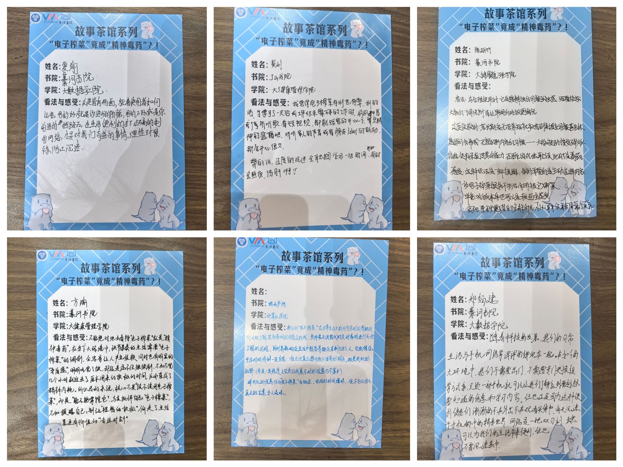 当电子榨菜成为赛博罂粟,我们餍足的是空虚的胃,还是被麻痹的灵魂?当“电子榨菜”从缓解孤独的“小确幸”,悄悄转变为占据时间、分散精力的“隐形负担”,它是否已经变了味?为更好的锻炼同学们表达能力与结构化思维能力,綦河书院于9月17日举办了故事茶馆系列活动(第41期),以“你的‘电子榨菜’有变成精神毒药吗”为题,引导同学们在写下自己“电子榨菜”的故事与看法中审视自我行为。