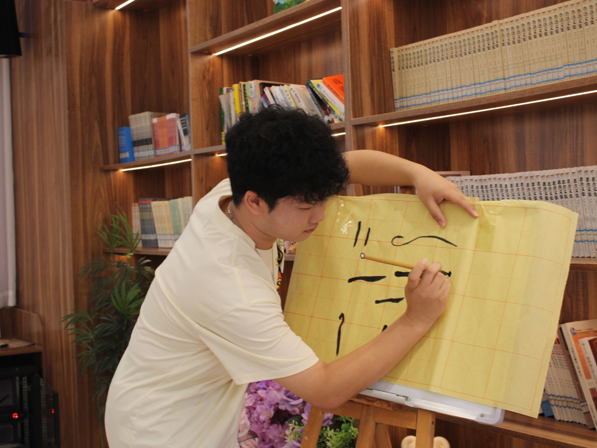 在笔法讲解环节,黄俊宇细致演示了基本笔画的书写方法,包括横、竖、撇、捺的起笔与收笔技巧,强调“筋骨并用、力透纸背”的书写要领。同学们认真聆听,不时提笔模仿,现场学习氛围浓厚。随后的实操环节中,大家纷纷铺纸蘸墨,在黄俊宇的指导下尝试书写。笔墨挥洒之间,一幅幅虽显稚嫩却充满诚意的习作逐渐呈现。同学们互相观摩、交流心得,书吧内洋溢着专注与愉悦的气息。