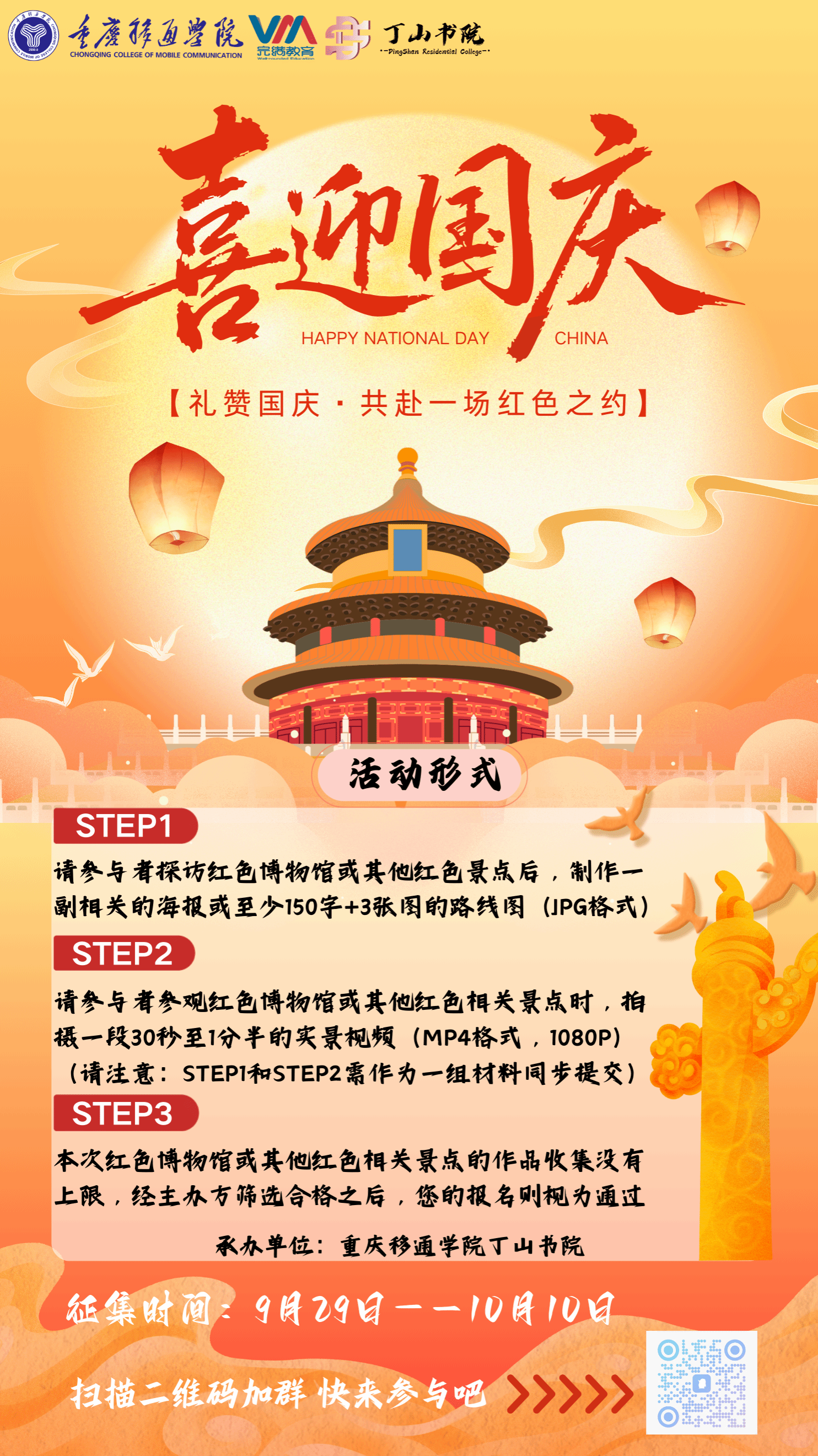 恰逢国庆佳节将至,丁山书院诚挚向你发出“礼赞国庆·共赴一场红色之约”征集活动邀请,让我们在红色足迹的探寻中深植家国情怀、共抒赤子之心,期待大家的踊跃加入!