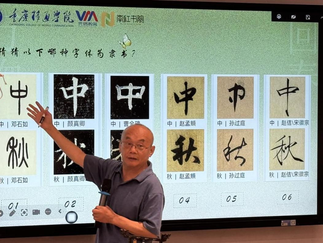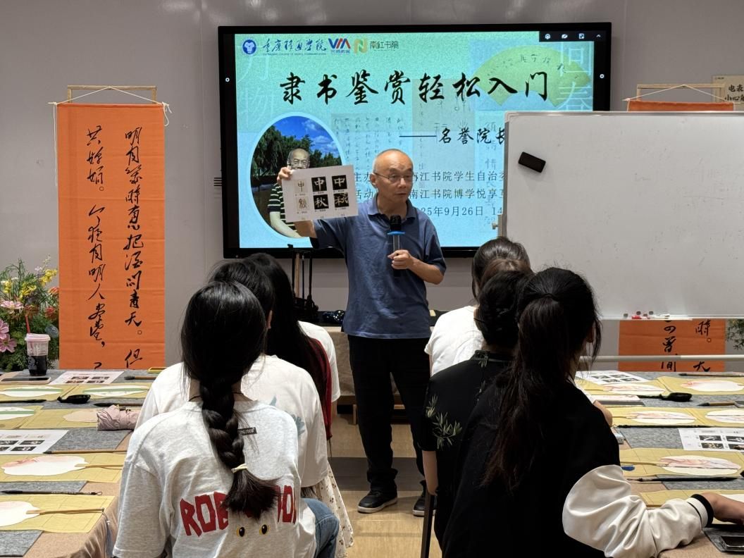 9 月 26 日,南江书院博学・悦享互动空间墨香初起,四十余名学子的目光被屏幕上的汉字牢牢吸引。南江书院名誉院长陈册教授开启 “隶书鉴赏轻松入门” 为主题的书法公开课,将隶书鉴赏与中秋意蕴交织,让传统文化在 “玩中学、练中悟” 里变得鲜活可触。