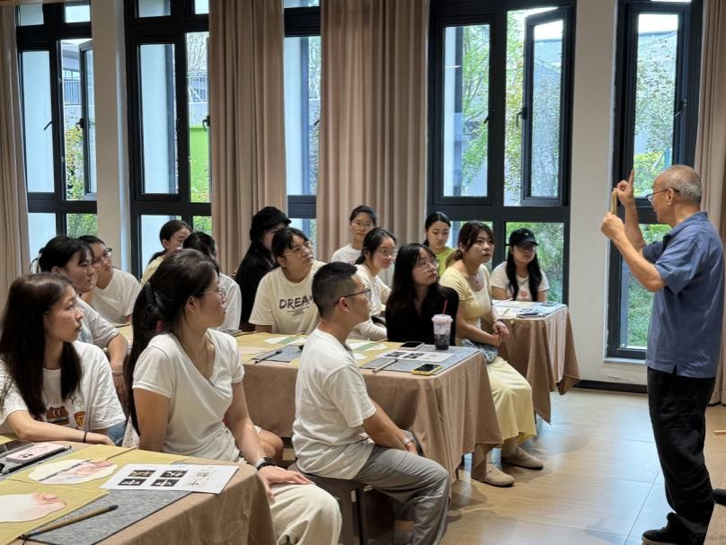“光看不说、光听不练,永远摸不透隶书的门道。” 课堂转入实践环节,“中秋隶书团扇创作” 让同学们瞬间兴奋起来。陈册教授率先拿起毛笔,在宣纸上轻转慢提,“金秋” 二字便带着墨香浮现。他边写边念叨细节:“起笔要藏锋,就像中秋前悄悄酝酿的期待;行笔得稳,跟踏秋时的从容劲儿一样;收笔要回锋,好比圆月终将圆满收尾。”