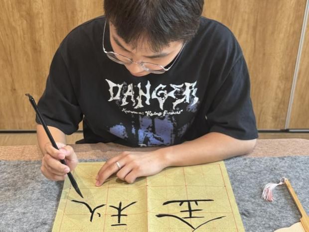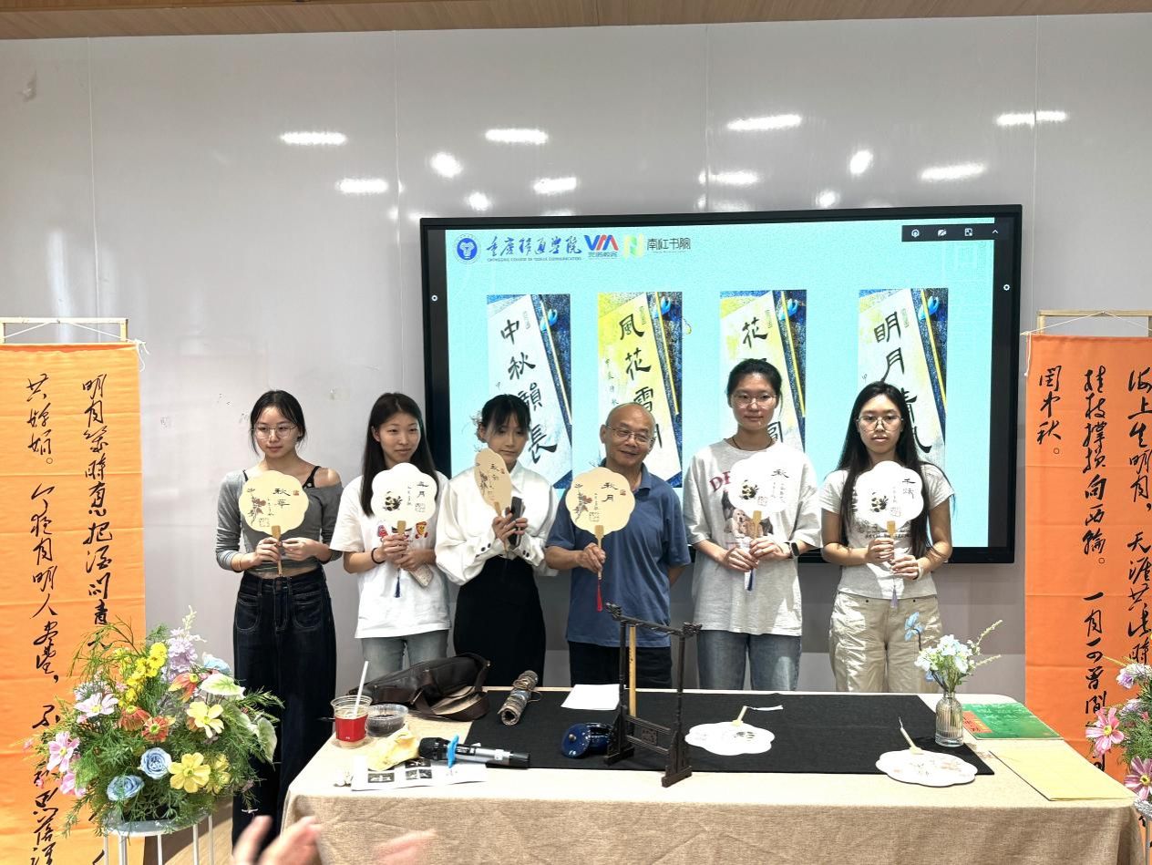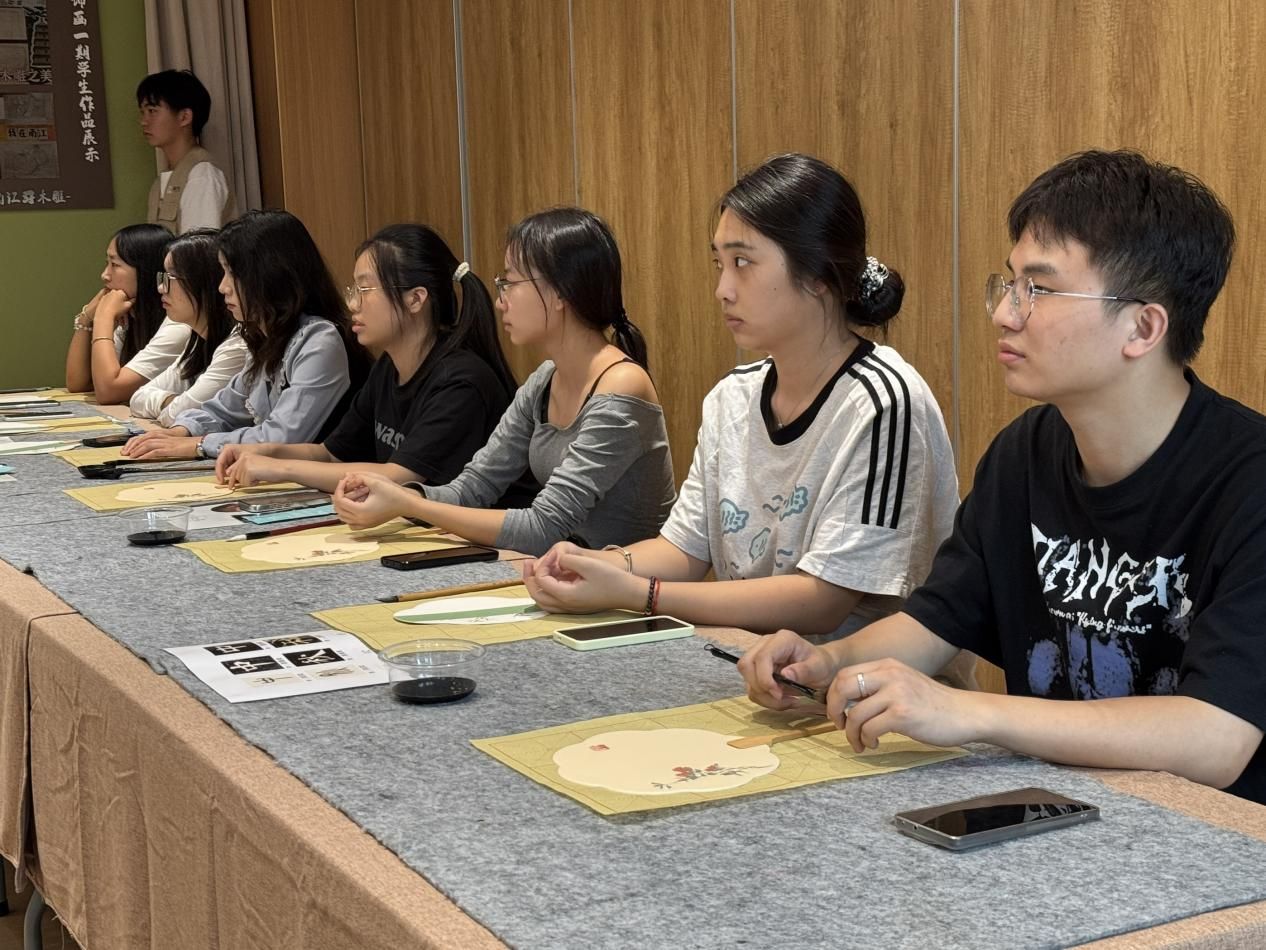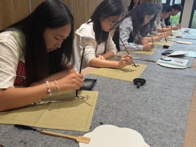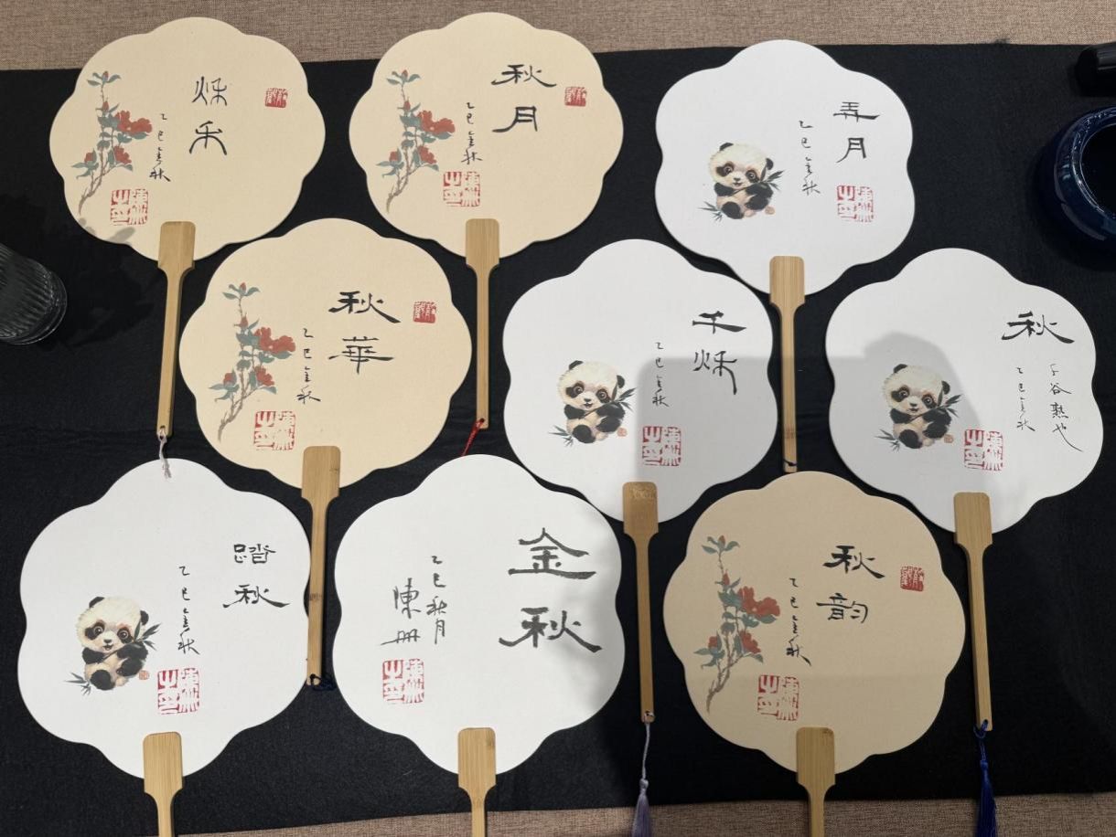 同学们跟着执起毛笔,从调整执笔姿势开始,一笔一划书写 “花好月圆”“中秋快乐”“千秋共赏” 等祝福语。墨香在空间里慢慢散开,原本普通的团扇渐渐有了温度 —— 有的同学笔下的 “月” 字波磔舒展,似圆月悬在扇面;有的 “圆” 字结构匀称,藏着对团圆的期许。陈册教授穿梭在课桌间,见谁握笔姿势偏了就轻扶手腕,发现运笔太急就提醒 “慢下来,让墨跟纸好好‘说话’”,每个同学都在指导下写出了专属的 “中秋墨宝”。