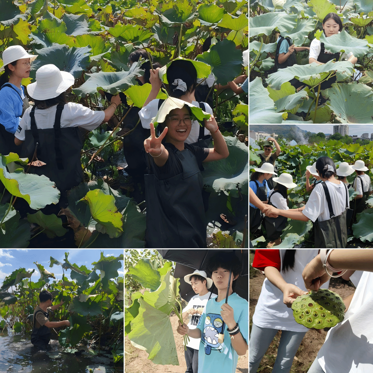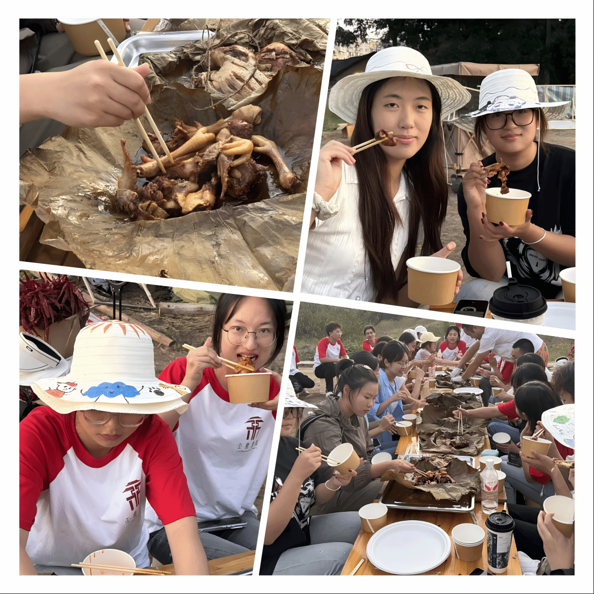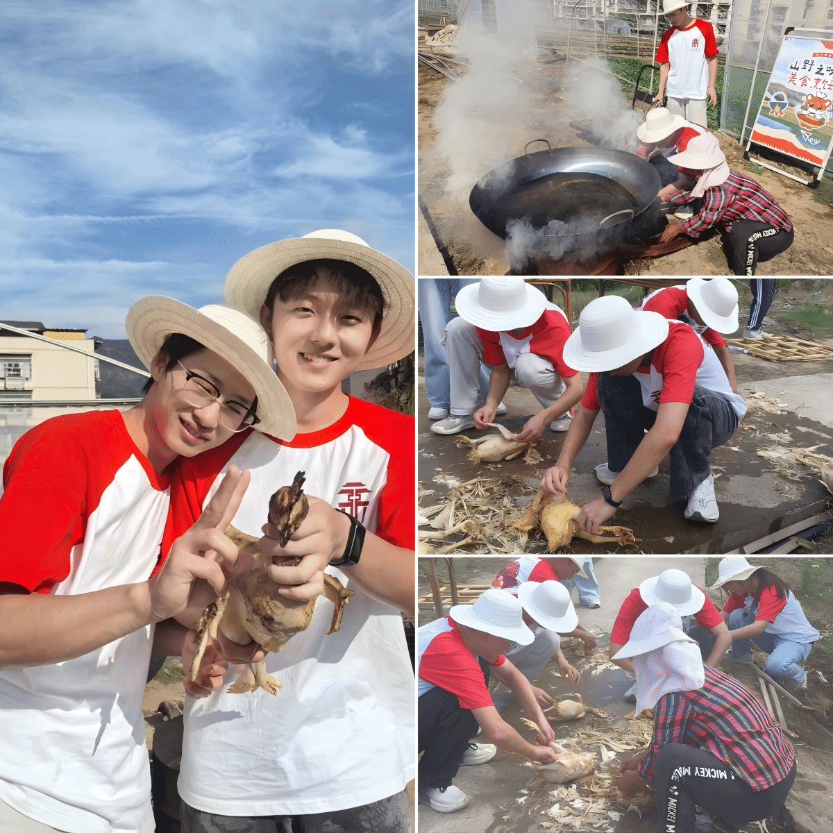 田间地头,同学们分工明确,默契配合,或徒手拔除,或使用锄头等农具,对田垄间的杂草进行了彻底的清理。创意十足的“草帽DIY制作”环节让大家在劳作间歇发挥巧思,用彩笔以及采集的野花绿草点缀草帽,即遮挡了阳光的刺眼,也为辛勤的劳动增添了诗意与趣味。“田间捉鸡”与“采摘荷叶”环节极大地考验了同学们的协作精神与应变能力。同学们亲手获取新鲜食材,分工合作制作“荷叶鸡”,从收拾柴火到起锅烧水,从清洗小鸡到码味进锅,在升腾的烟火气中掌握了生活技能。终于品尝到由自己汗水浇灌出的劳动果实,那种满满的成就感,仿佛比荷叶的清香更加沁人心脾。