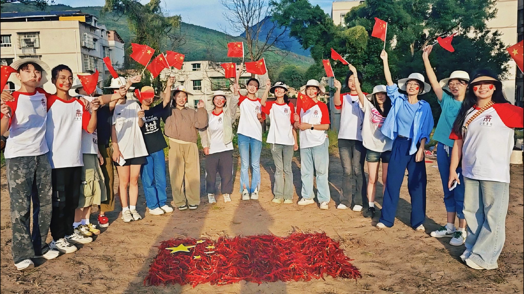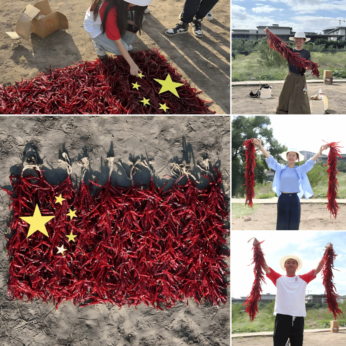 “从井冈山时期的‘自己动手、丰衣足食’,到新时代脱贫攻坚的奋斗历程,正是依靠这种实干精神,我们国家才取得了一个又一个辉煌成就。”贺老师的话语在田野间回荡,同学们围坐聆听,在泥土的芬芳中感受思想的洗礼。随后,同学们用一颗颗火红的辣椒和金黄的五角星,在田间空地精心拼贴出一幅鲜艳的“国旗”。这一独特的仪式,将劳动成果与爱国情感具象化,让“热爱劳动、热爱祖国”的精神种子于潜移默化中深植于每位同学心间,激发了为民族复兴而刻苦学习、努力奋斗的赤子之心。