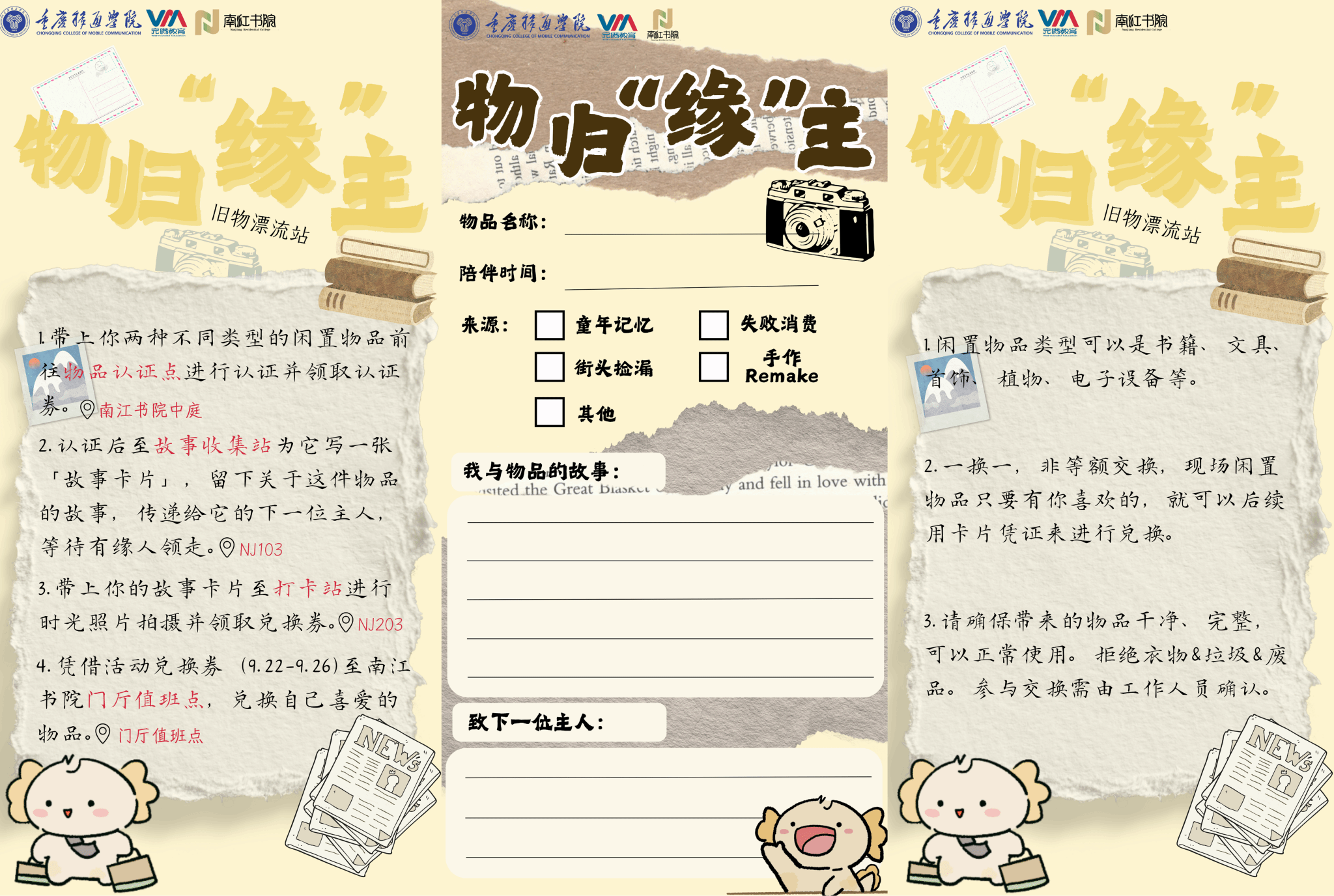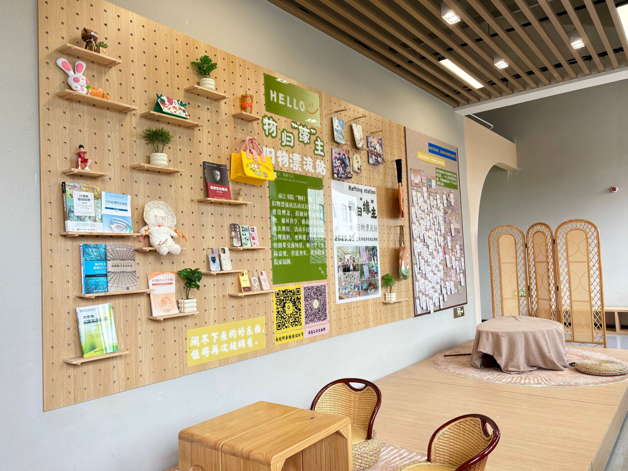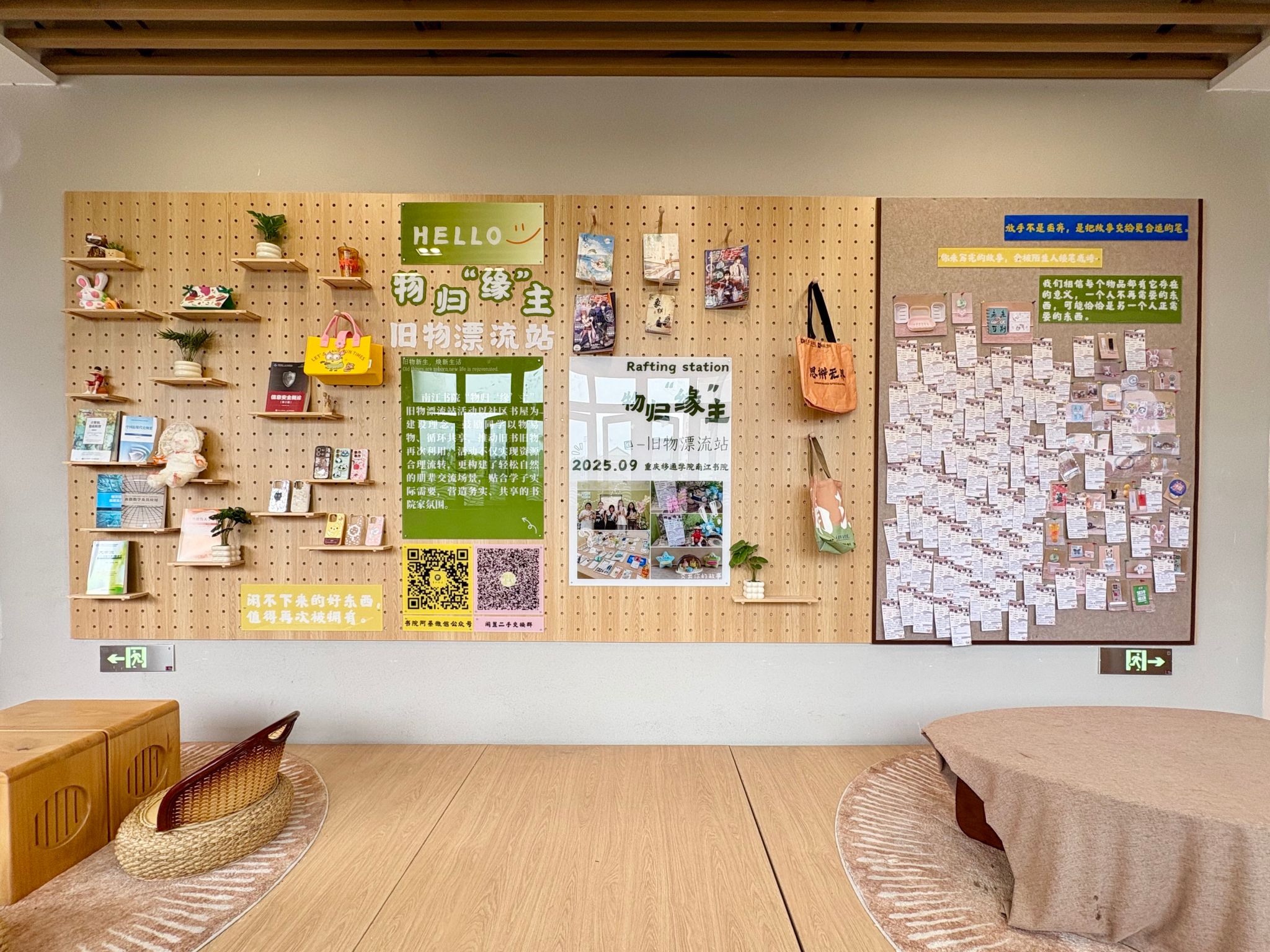 南江书院“物归‘缘’主”旧物漂流站活动源于一次寝室走访,书院学子都有不再使用的旧书,弃之可惜,留之占地。于是由南江书院牵头,一个不仅限于旧书,更包括各类仍具使用价值的、闲置物品交换的转换站诞生了。书院始终以学生为中心,依托“社区书屋共享平台”打造理念,鼓励大家以物易物、循环共享;更希望借助每一件物品,搭建一个有温度的朋辈交流空间,让旧物重生,也让情感流动。