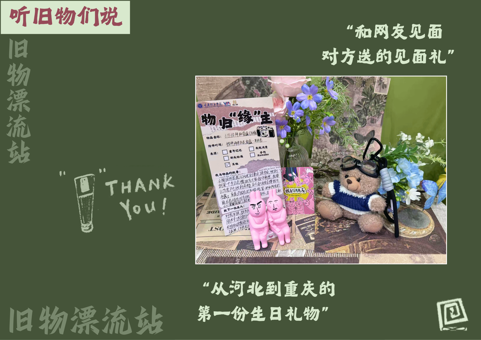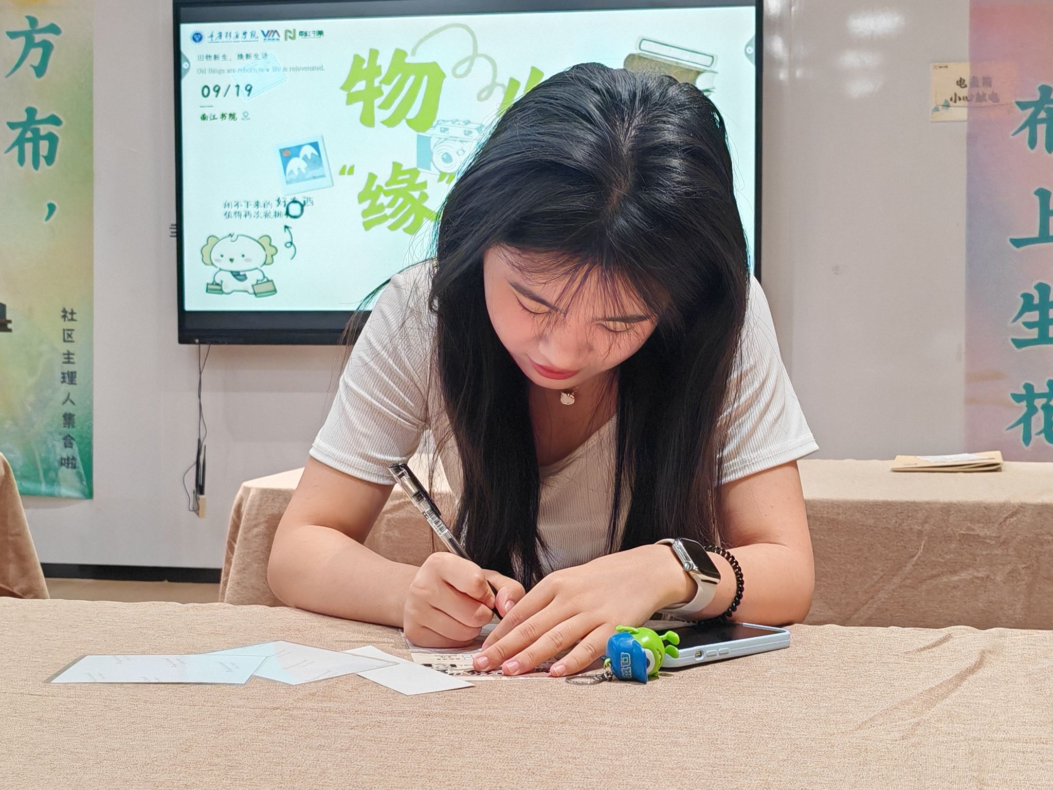 这些卡片和物品不仅是物质存在,更是承载朋辈交流的载体。手持交换券的学子们穿梭于物品之间,分享物品背后的故事。每一次交换,都象征新的起点;每一次对话,都增强了社区学子间的联结。在这里,物品已超越其物质形态,成为促进沟通、共建共享的媒介。
