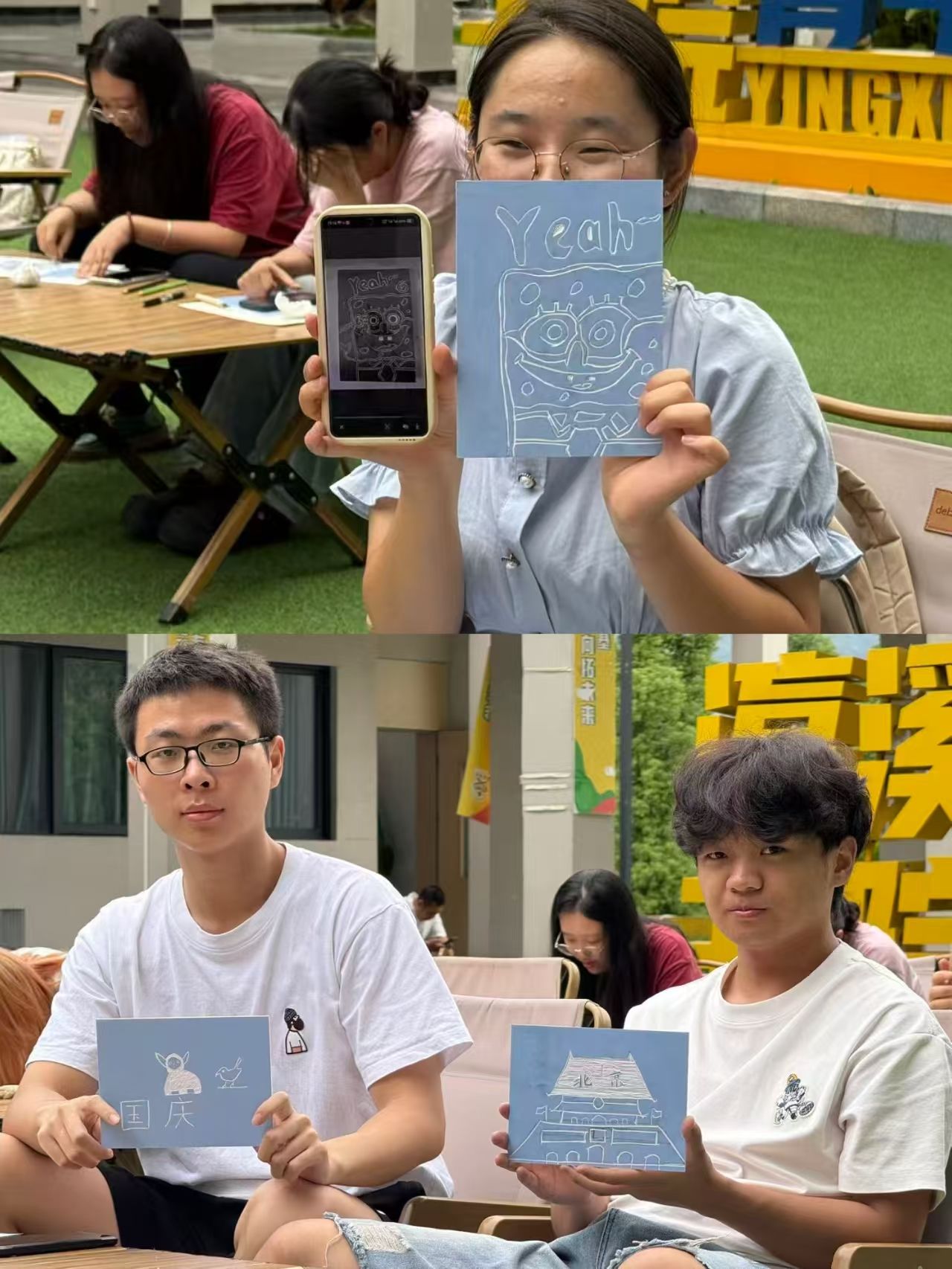 活动现场,翠绿的草坪上,折叠桌椅有序摆放,蓝色木板、刻刀等工具整齐罗列。他们手持刻刀,在蓝色版画上精心雕琢。有的以经典卡通形象海绵宝宝为创作对象,不一会儿,海绵宝宝的形象便逐渐清晰,还在上方刻上“YEAH”字样,充满青春活力;有的将国庆元素融入其中,刻出可爱的小羊与小鸟形象,旁边配上“国庆”二字,表达对节日的美好祝愿;还有的以北京建筑为蓝本,刻画出门楼、屋檐的轮廓,表达对首都的向往与敬意。刻制过程中,时而传来刻刀与纸张摩擦的沙沙声,时而有同学们讨论刻制技巧,专注与活力在现场交织。
