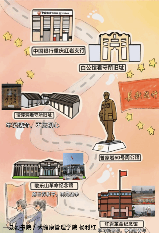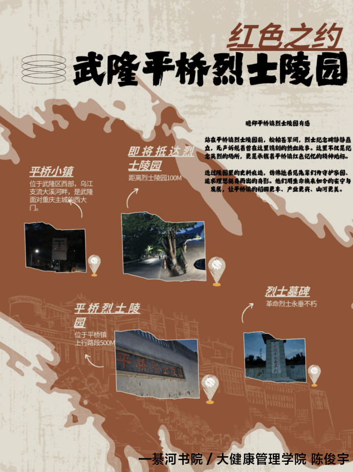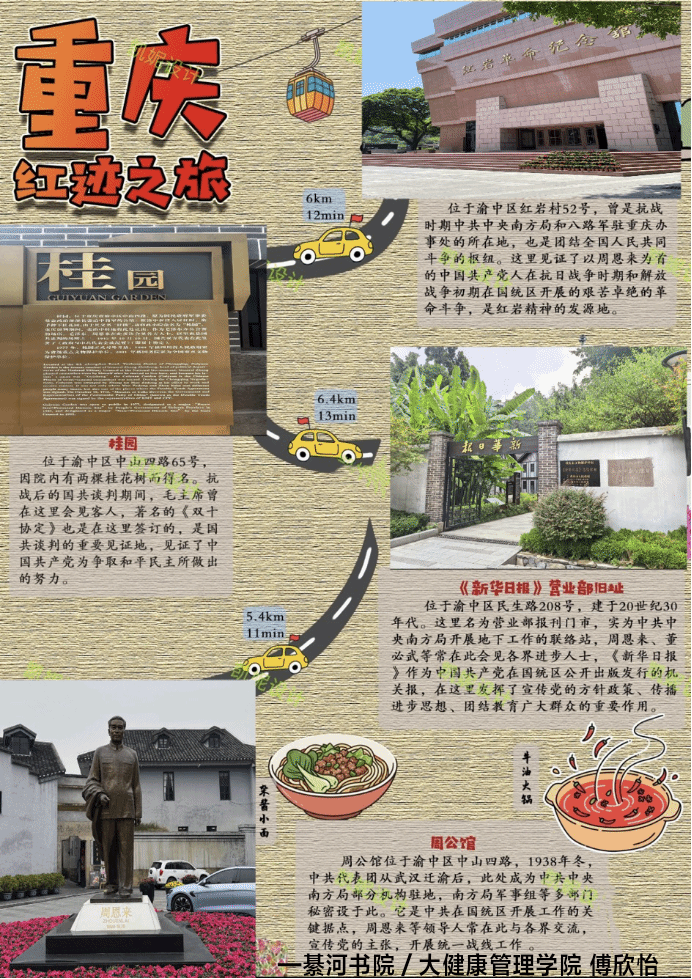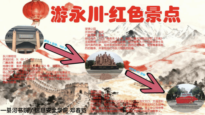 活动要求参与者将探访感悟转化为富有创意的数字作品。学子们积极响应,提交了大量饱含深情的作品:30秒现场短视频里,镜头或定格于肃穆的烈士纪念碑前轻声诉说敬意,记录下沉浸式参观的震撼瞬间;精心设计的主题海报,以鲜明的色彩、有力的构图,艺术化地诠释了革命传统的深刻内涵;清晰绘制的红色景点探访路线图,不仅标注了永川等地景点的探访顺序,更成为同龄人追寻红色足迹的实用指南。每一帧画面、每一笔色彩、每一处标记,都无声地流淌着对红色历史的深切敬畏,以及对祖国炽热滚烫的赤子之心研学感悟成长,红色基因传承。