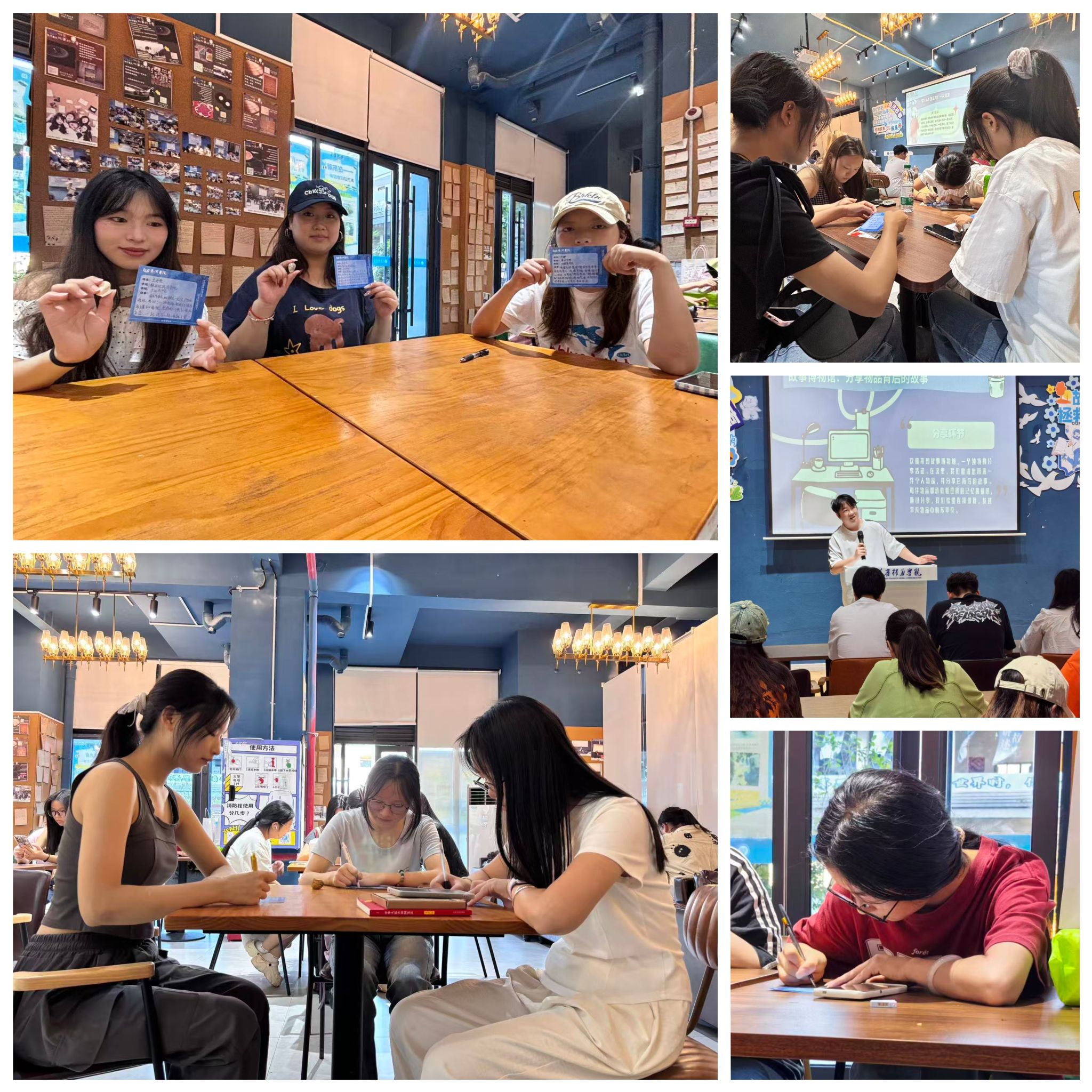 主持人先向大家讲解了“故事+物品”的分享规则,随后写故事环节正式开启,同学们纷纷拿出藏着回忆的物件,把假期故事娓娓道来。来自綦河书院大健康管理学院的陈虹庄同学分享着属于她的空瓶故事,她在卡片中写道:“这个空瓶子里住着一卷待开启的画卷,国庆七天,我带着它穿行在人海与山河之间,每当拿起它,仿佛能听见时光的回响。”丁山书院数字经济商学院的艾凤婷同学则分享车票的故事,卡片中写道:“未及卸去假期慵懒,匆匆返校落座即走,一切都刚好。”空瓶与车票,再配上几句走心文字,让这两位同学抽象的假期记忆变得可触可感,清晰地展现在大家面前。