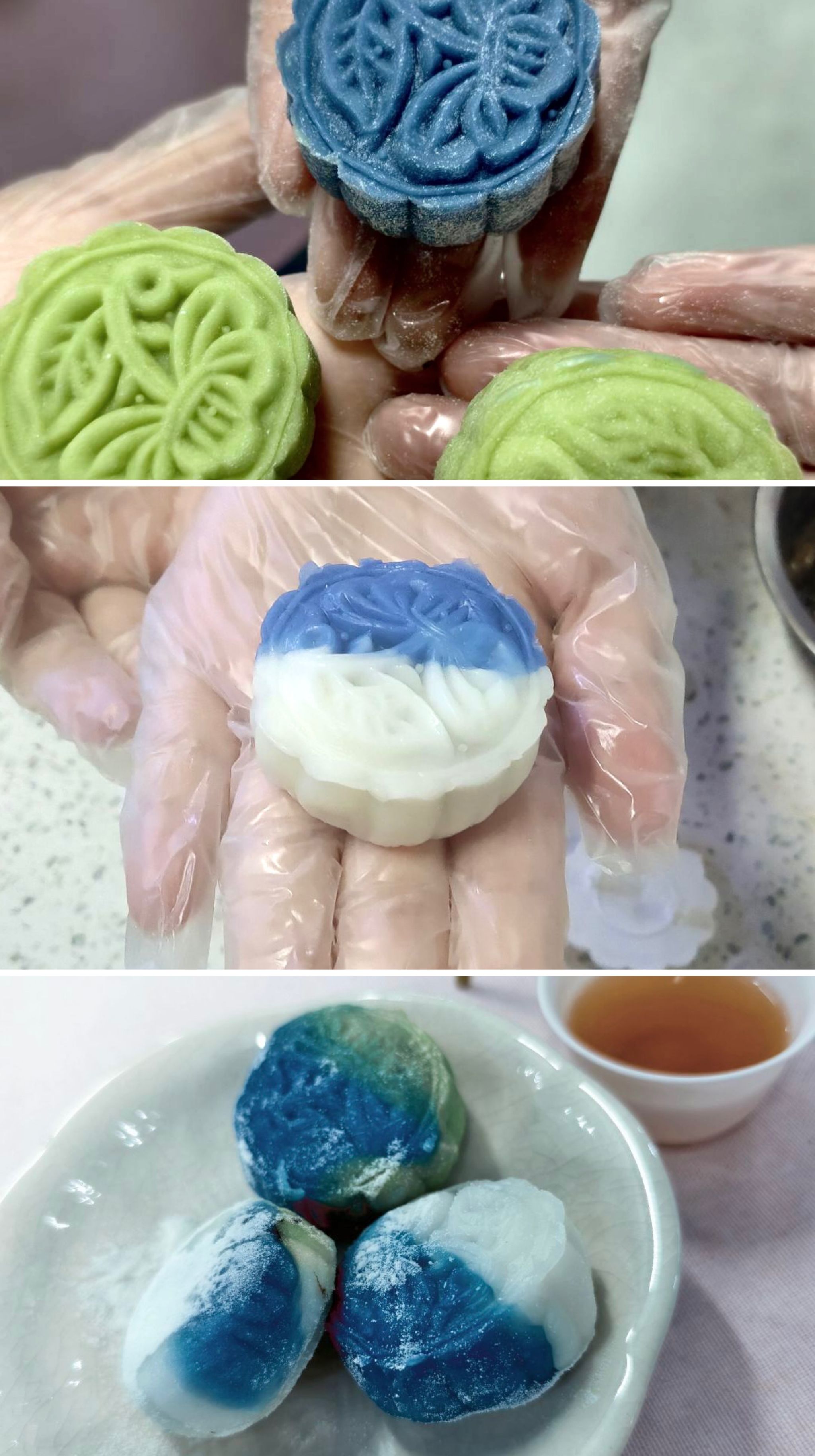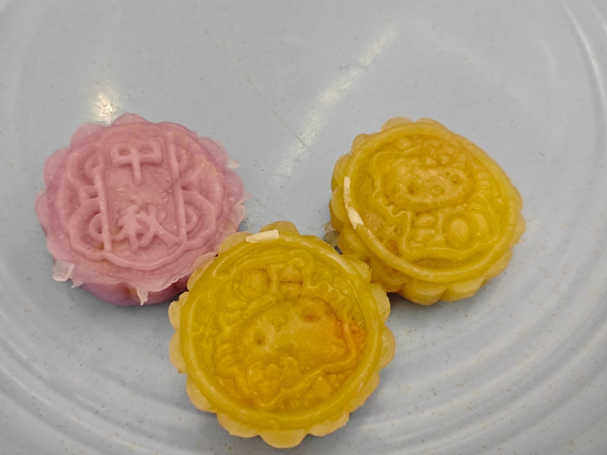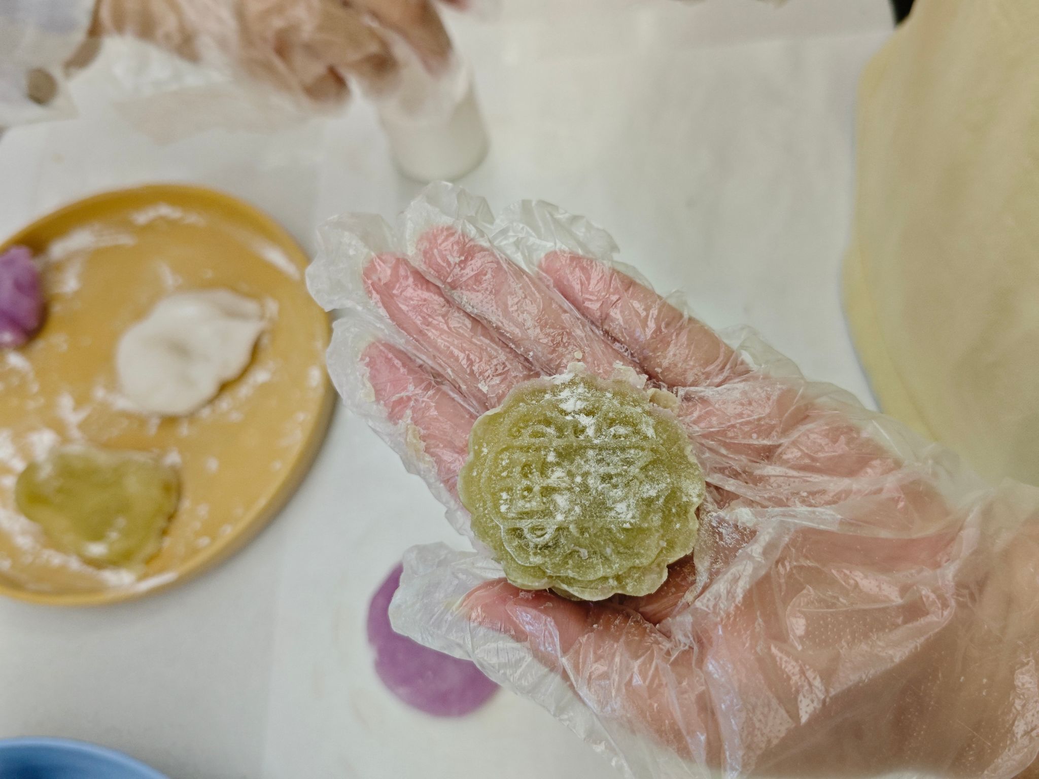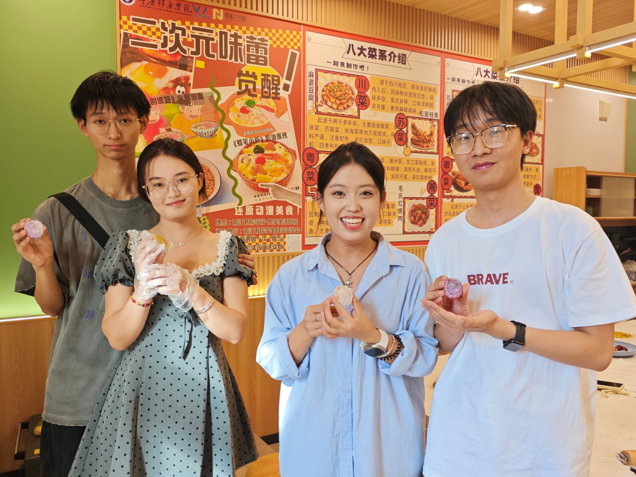 活动现场暖意氤氲,学子们围案而立,揉面团,裹馅料,一个个印着中秋、玉兔的月饼便逐渐成型。有人分享家乡月饼的清甜记忆,有人手把手纠正揉面手法,笑语与面粉轻扬交织,让异乡的中秋有了家的温度。