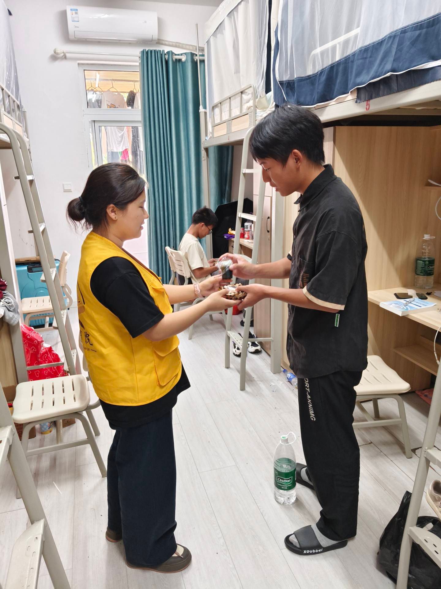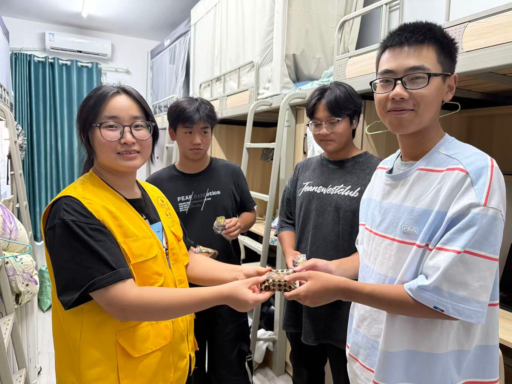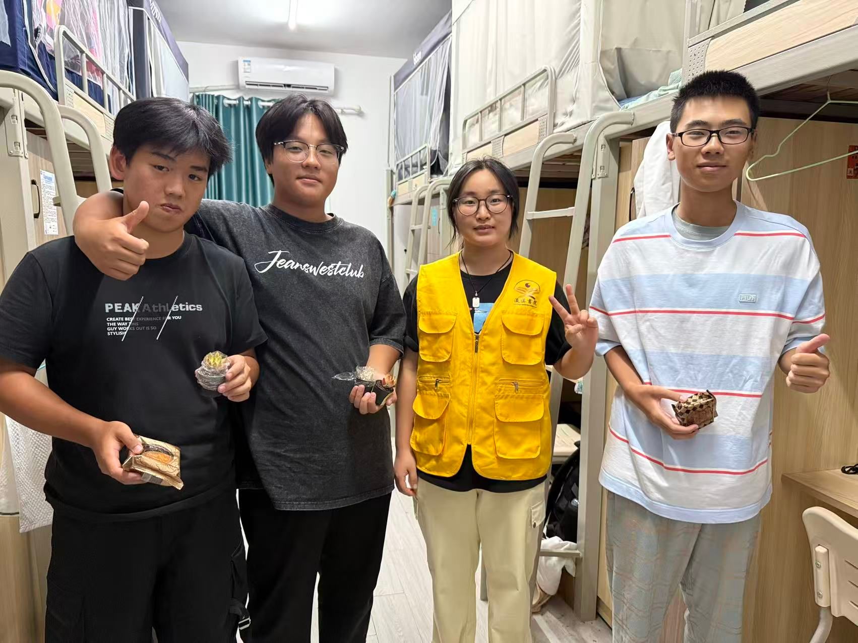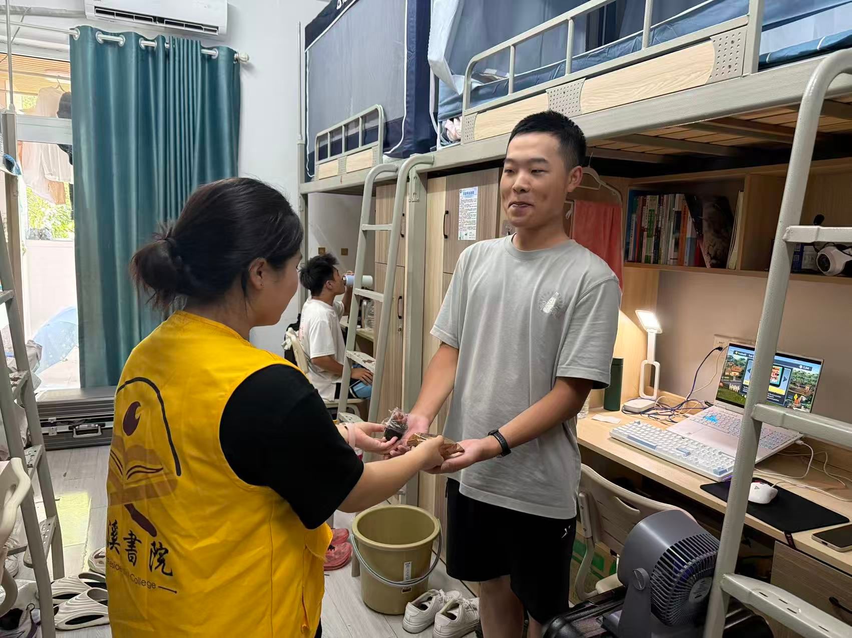 走寝进行时,瀛溪书院自治委的同学们将月饼和小礼物递到刚军训完的大一同学手中,关切询问近期学习生活情况,叮嘱同学们合理安排假期,外出旅行也需注意安全。一份份香甜的月饼不仅饱含着对学子们的深切关怀,更寓意着团圆美满、幸福安康的美好愿景。