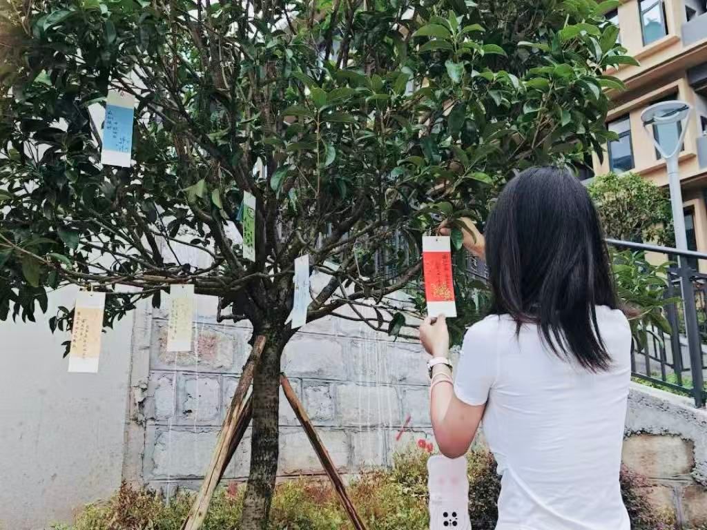 同学们轻步走进“雅集”现场,伴着庭院飘来的桂花香,老师细细讲述中秋赏灯、制书签的传统习俗,一下子拉满了节日氛围。跟着屏幕里的教程,同学们很快扎进手作里:穿贝壳风铃时认真比对每片贝壳的弧度,细心糊好花灯的边缘,在桂花书签上写下“中秋安康”的小小心愿。做好的书签被大家小心挂在庭院的树枝上,整个书院都浸在温柔的中秋氛围里。这一刻,中秋不再是远方的团圆念想,而是手里能摸到的风铃、花灯,是挂在枝头的书签——成了触手可及、能藏进记忆里的书院温暖。