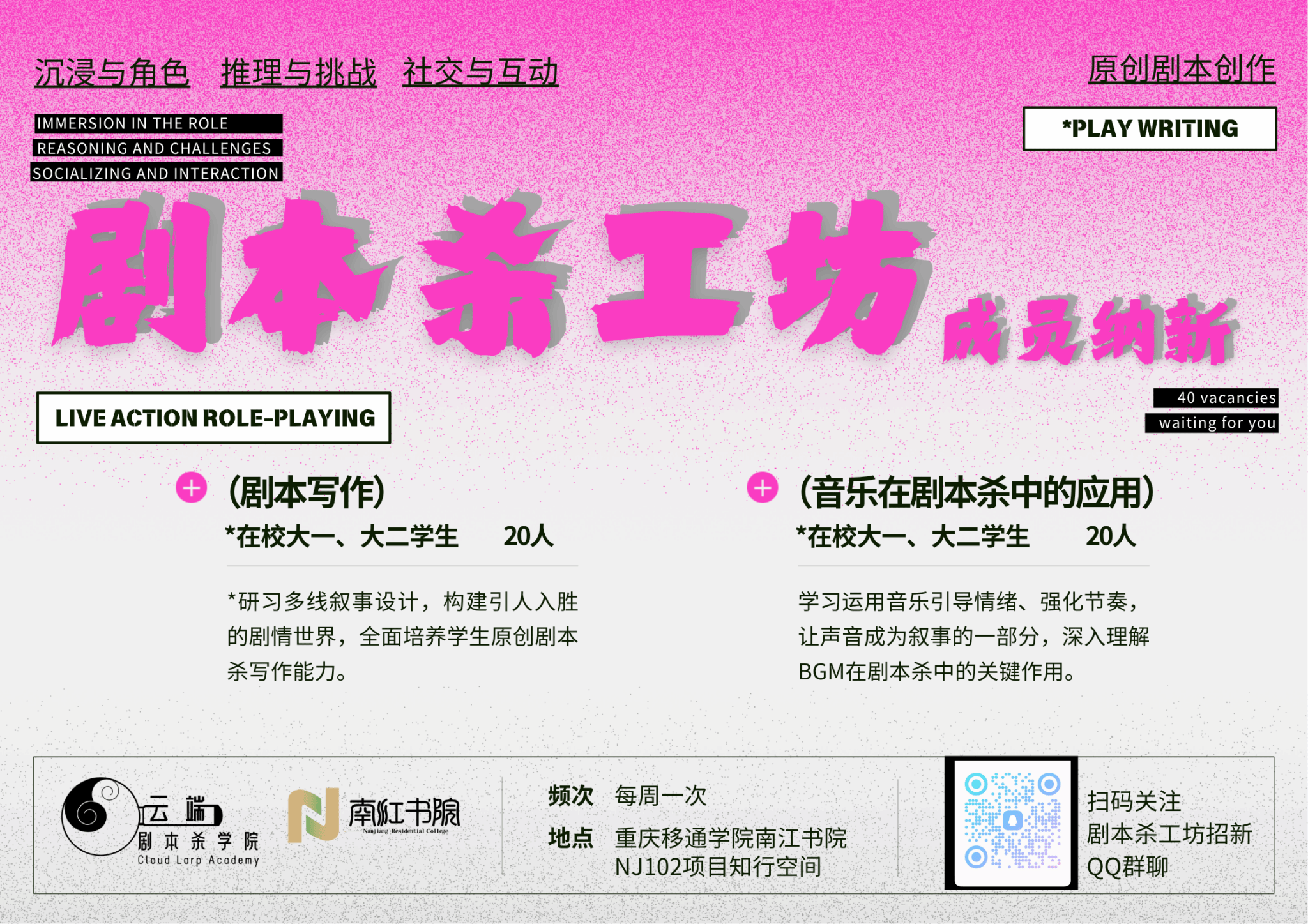 工坊课程共分为剧本写作与音乐在剧本杀中的应用两个方向,以一学年为培养周期,在理论与实践的交叉互动体验中沉浸剧本演绎与创作。工坊主要面向全校大一、大二学生进行成员招募(两个方向预计各招募20人)。