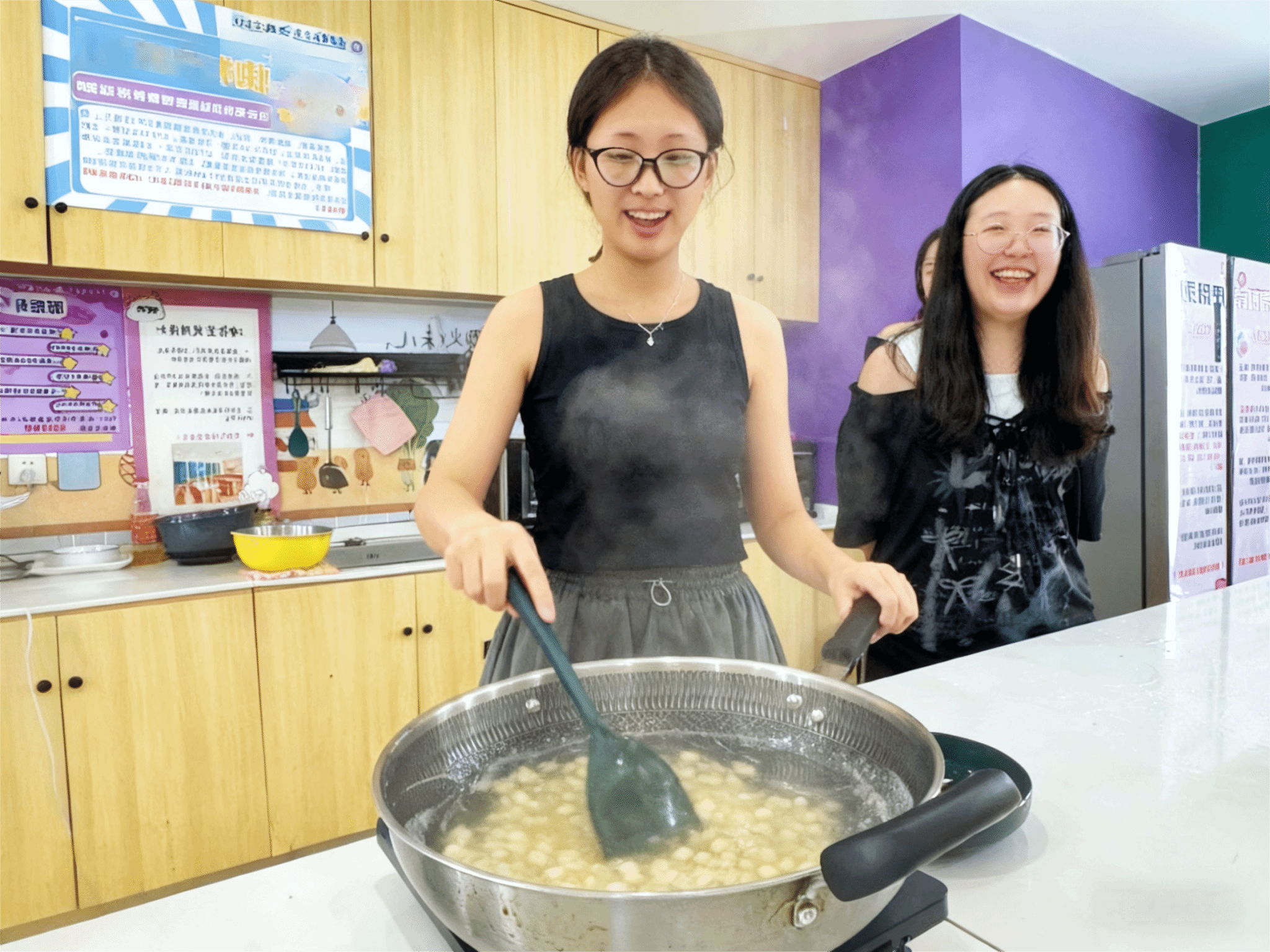 案板上,泡发好的花生粒粒饱满,小组成员正细心剥去花生衣。前期准备时,大家挑选优质花生浸泡数小时。切菜环节虽无复杂操作,但剥花生衣的耐心尽显。随后,花生入锅加水,小火慢熬数小时,期间不断搅拌防止粘锅。当花生熬至软烂,加入适量冰糖调味,继续熬煮至糖融化。装盘时,一碗碗色泽乳白的花生汤散发着浓郁的花生香气,入口绵密甘甜,暖意流淌在每位同学心间,仿佛感受到了福建街头巷尾的温情。