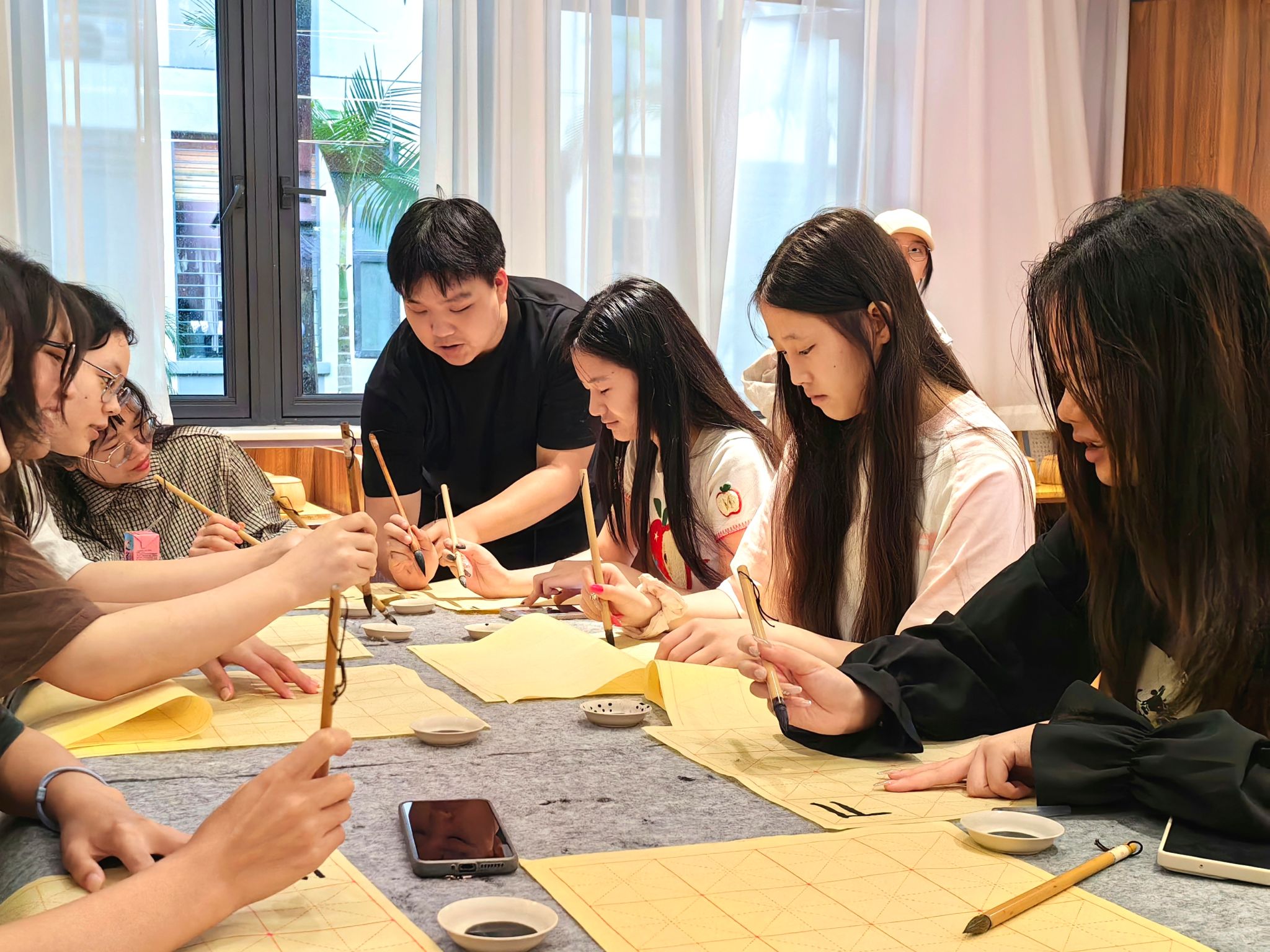 随后的实操环节中,同学们铺纸研墨,在谢林志同学的引导下,从单字结构入手,尝试控制笔画间距与部件比例,体会“疏可走马、密不透风”的章法意趣。过程中,大家互相观摩、交流心得,不少同学在反复调整中逐渐把握了隶书结构的平衡感与秩序美,现场学习氛围浓厚而专注。
